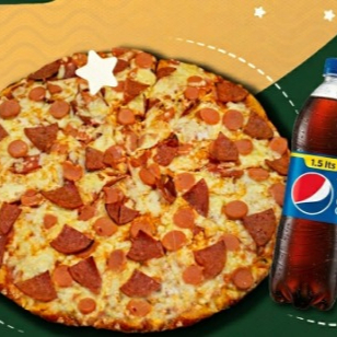 Deliciosa pizza con Tocino, Cebolla morada fresca y ricos trocitos de Salami, acompañada de nuestra base de 3 Quesos