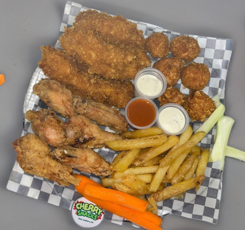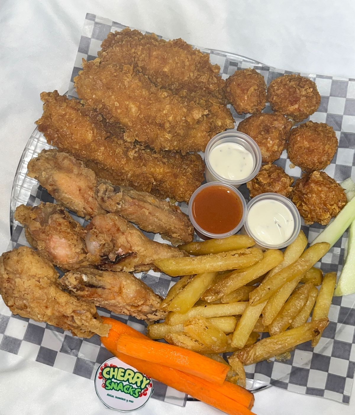 6 Alitas, 6 tiras, 6 boneless y papas a la francesa. Bañados en salsa de su elección (BBQ, búfalo, mango habanero o cajún).