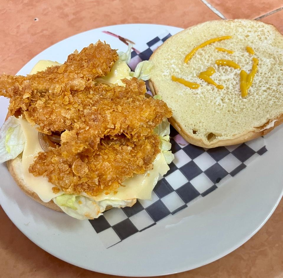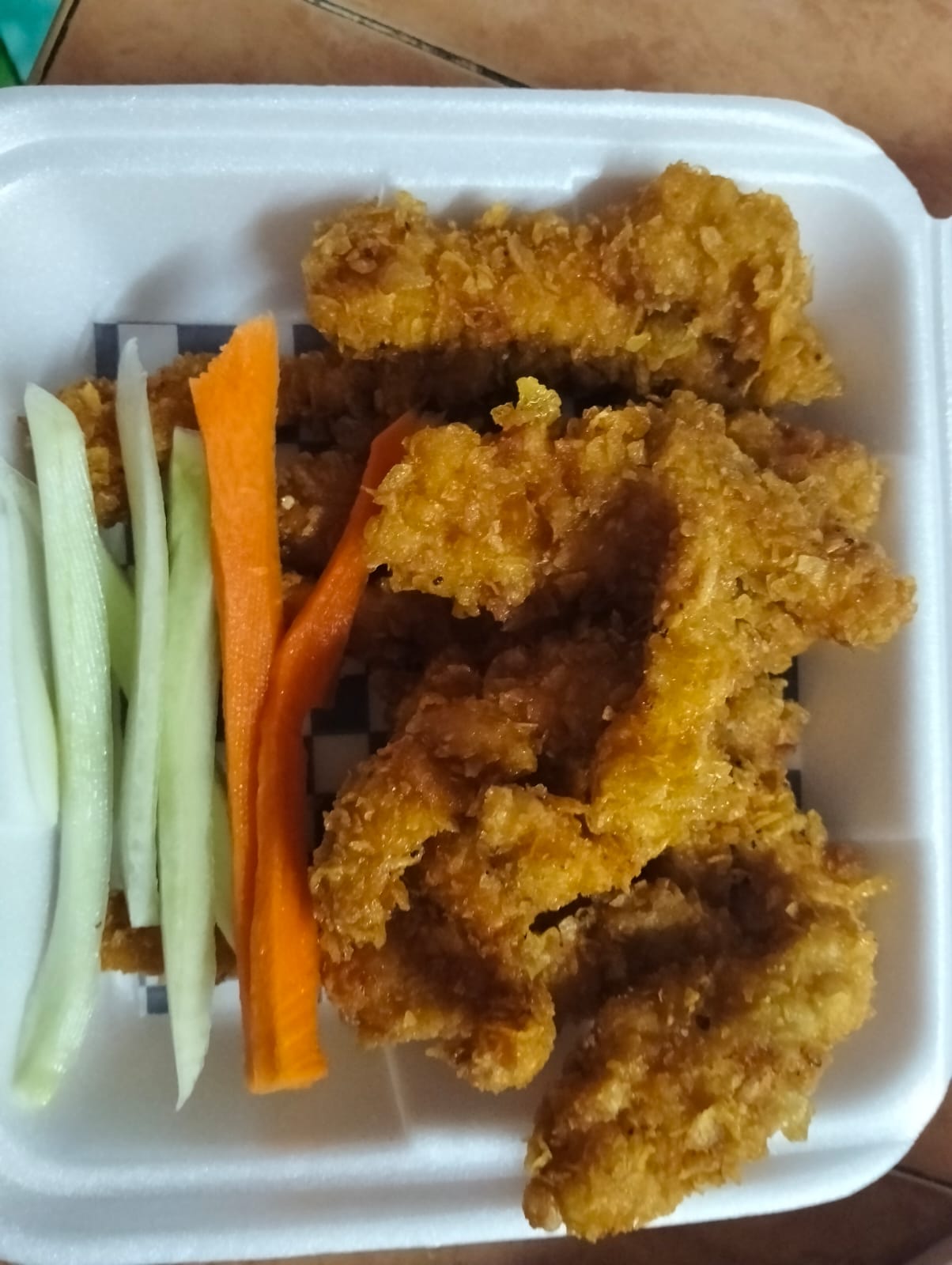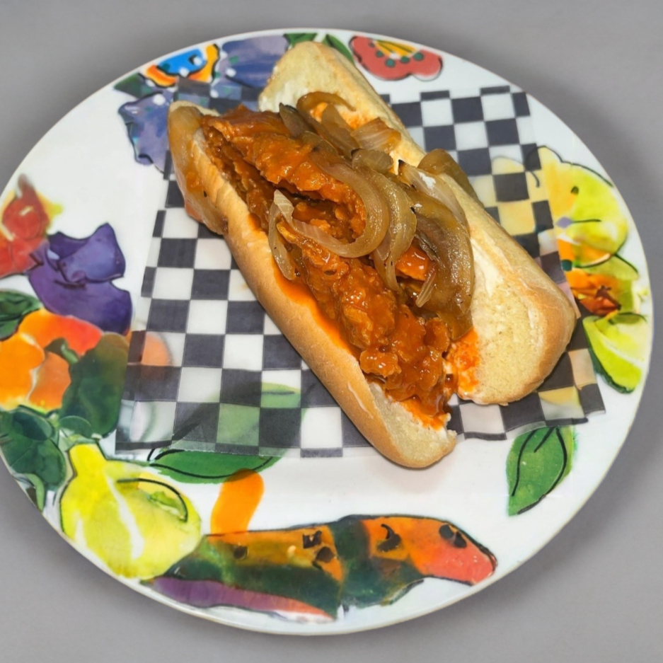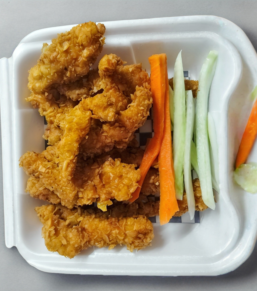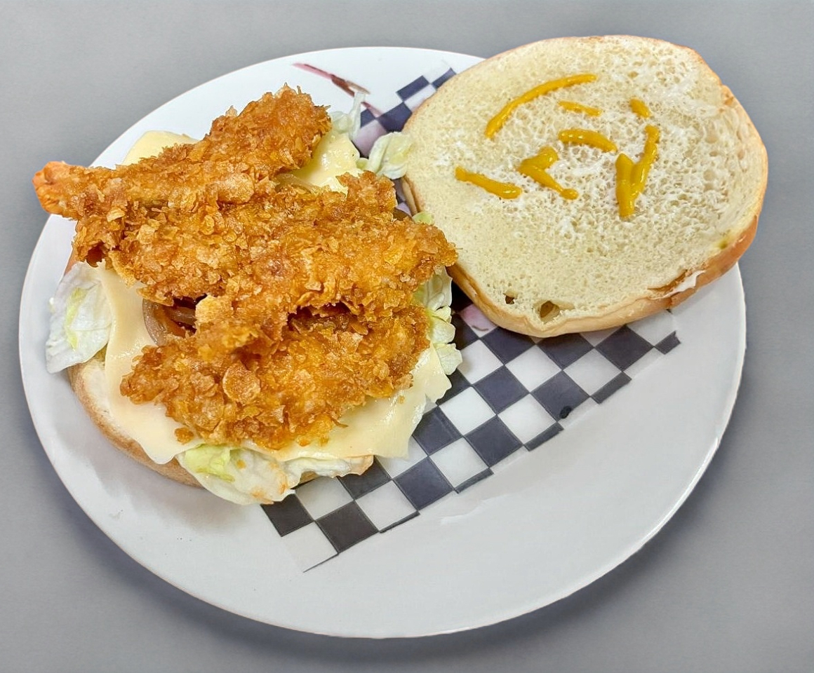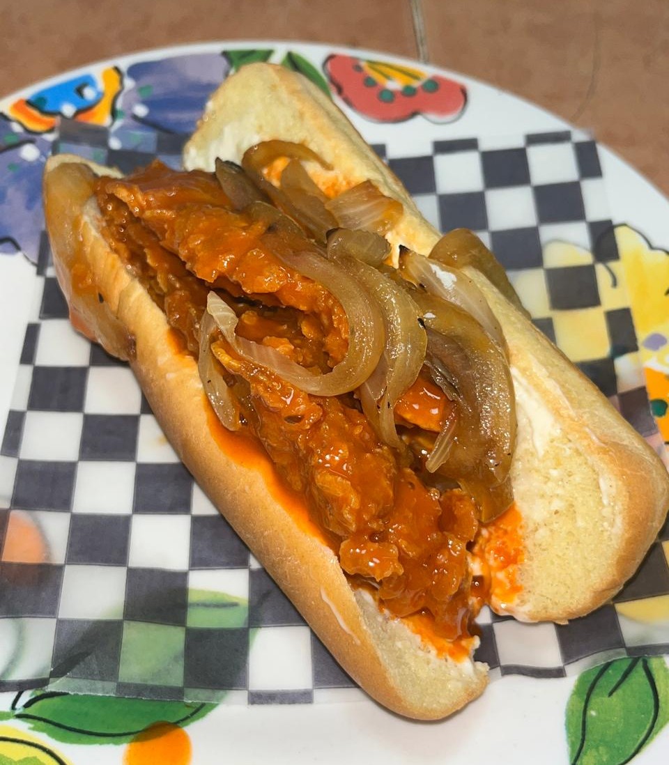 Tiras de pechuga de pollo crispy, (salsa elegir: BBQ, búfalo, cajún o mango habanero), cebolla caramelizada, tocino, mayonesa y mostaza.