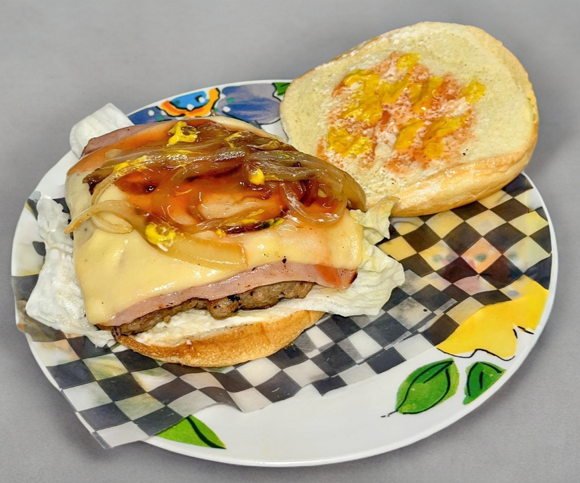 Jamón, queso, tocino, romanita, cebolla caramelizada, mayonesa y mostaza.