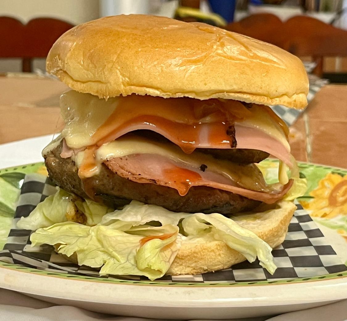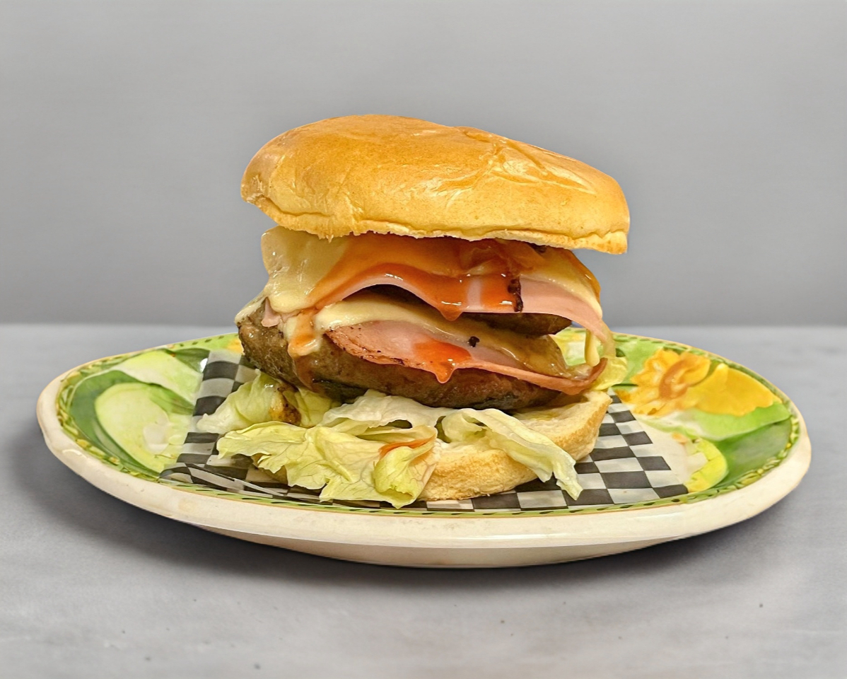 Doble carne, doble jamón, doble queso, tocino, romanita y cebolla caramelizada.