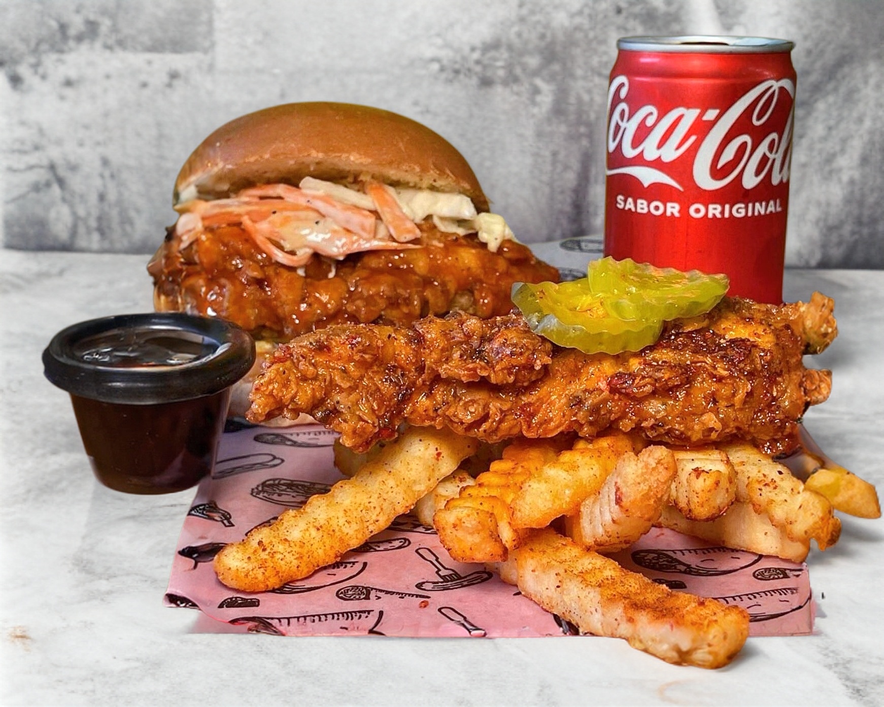 Pan brioche + coleslaw + pechuga frita + BBQ + ranch acompañado de papas a la francesa