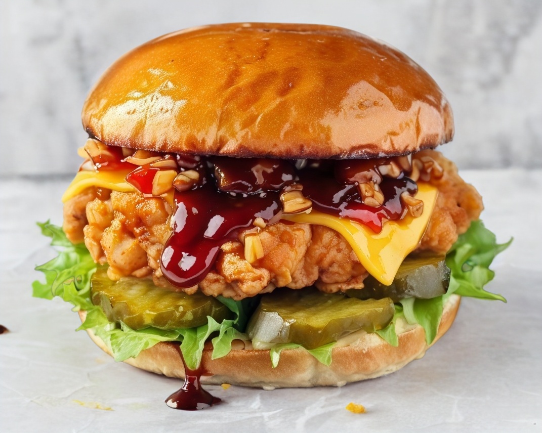 Pan brioche tostado con mantequilla, pechuga de pollo crujiente con salsa red hoy especial, salsa ranch en la base acompañado de pepinillos y lechuga