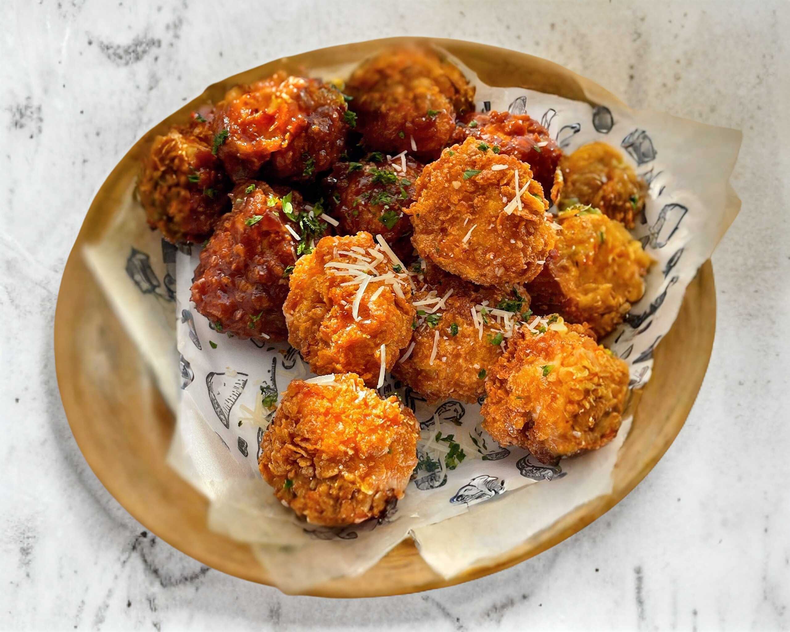Palitos de queso mozzarella empanizado acompañado de salsa red hot buffalo