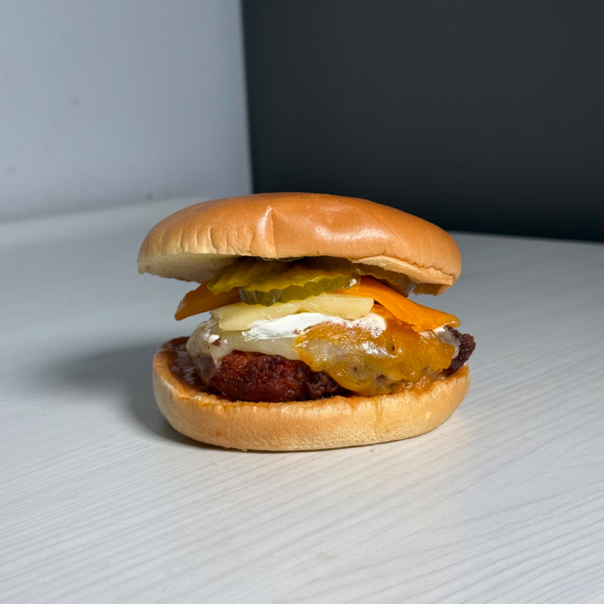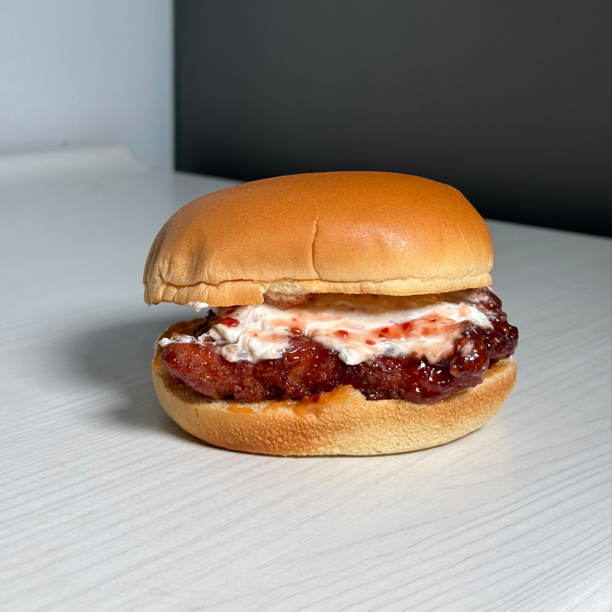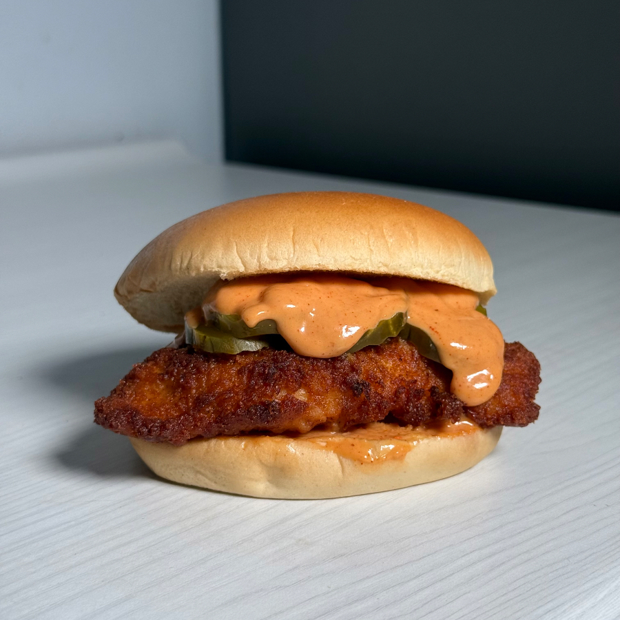 Filete de pollo frito, salsa secreta y pepinillos en pan brioche.