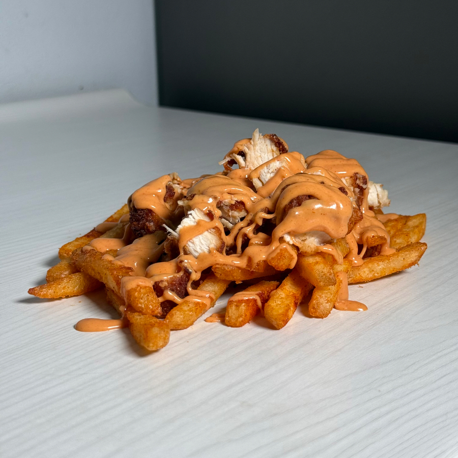 Base de papas fritas, filete de pollo y salsa chowsauce