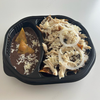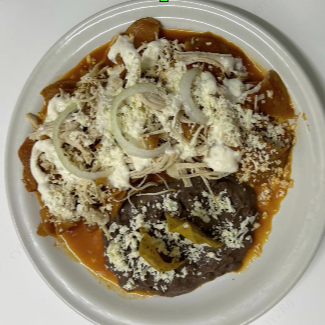 Los auténticos chilaquiles picantes, acompañados de cebolla, media crema, queso cotija y frijoles.