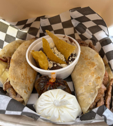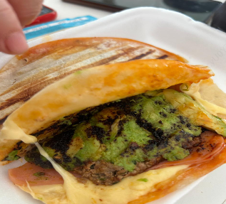 2 Tortillas de harina rellenas de queso gouda, carne de hamburguesa casera, aguacate, nuestra salsa especialidad macha morita y champiñones.