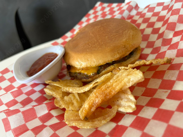 Carne casera, queso cheddar, tomate, cebolla, mayonesa, mostaza y cátsup. Incluye papas.