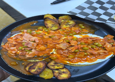 Huevos montados sobre tostada casera con una cama de frijol, bañados en salsa con morita, jamón de pavo y chicharos. Acompañados de plátanos fritos.