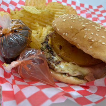 Carne casera, queso cheddar, jamón de pavo, piña, cebolla, mayonesa, mostaza y cátsup. Incluye papas.
