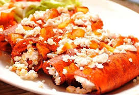 4 pzas De enchiladas de pollo bañadas en nuestra salsa roja de la casa, crema, queso manchego gratinado, cebolla y cilantro.