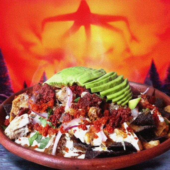 Una fusión de sabores tan intensa que te dejará upside down: totopos de maíz azul, salsa potosina de picor medio (el nivel exacto de sabor). un mix de carnes irresistible: castacán + longaniza de valladolid + chorizo español. todo coronado con abanico de aguacate.