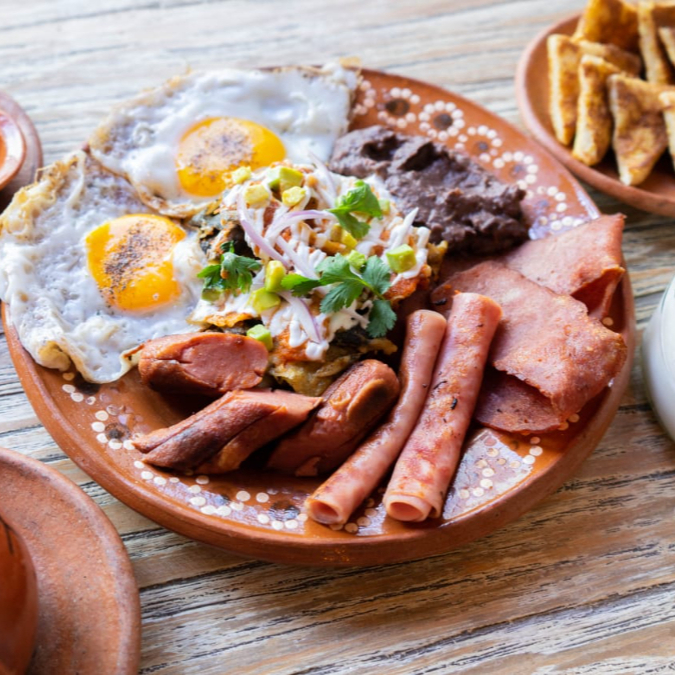 Huevos fritos acompañados de salchicha, tocino, una porción de chilakilez de la casa y pan.