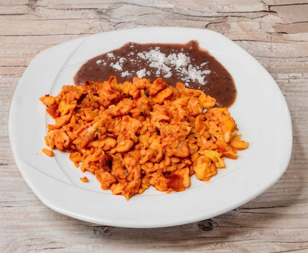 Tortilla de harina, frijol, huevo revuelto con longaniza, bañado en salsa de tu eleccion, con crema y queso sopero.