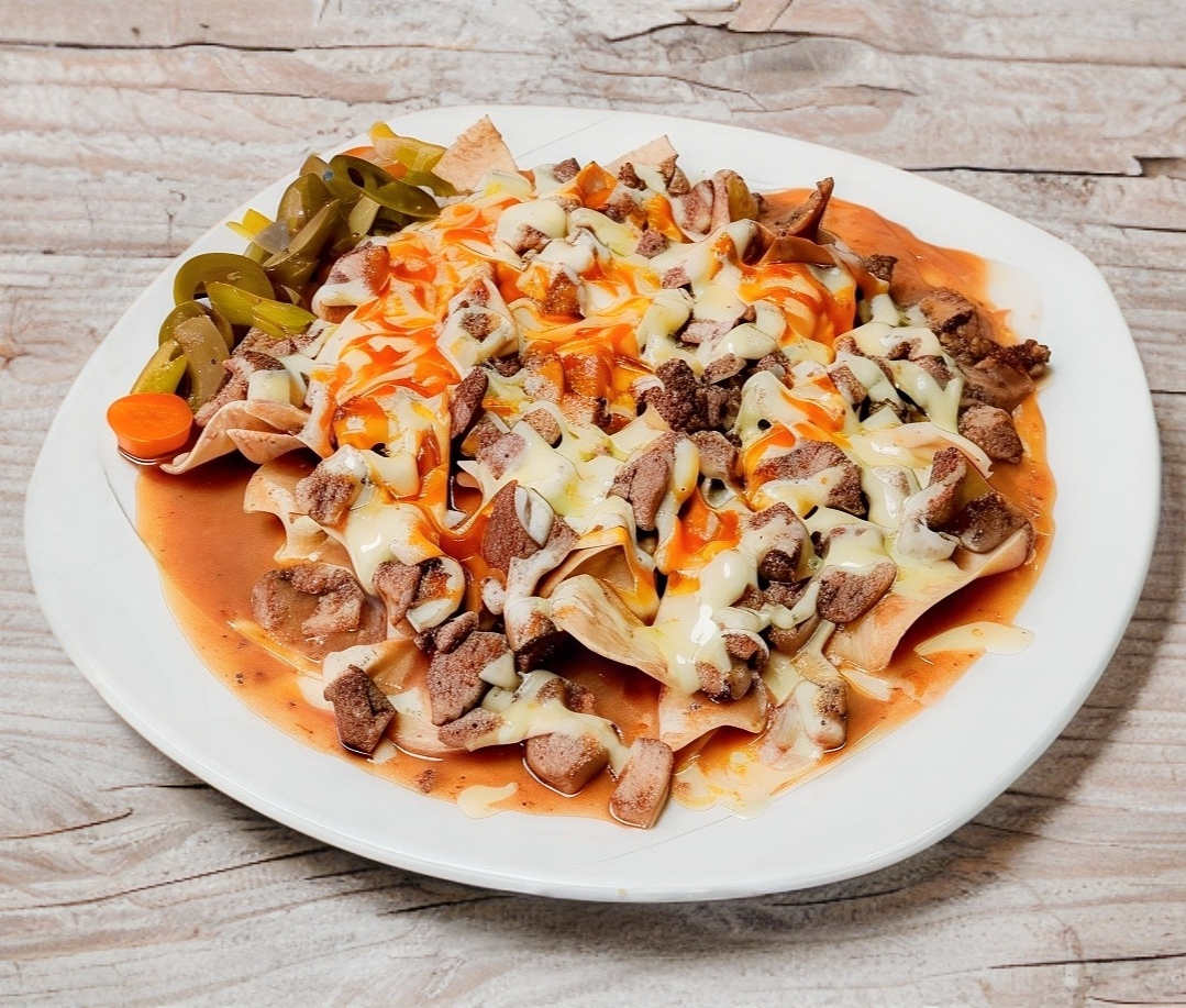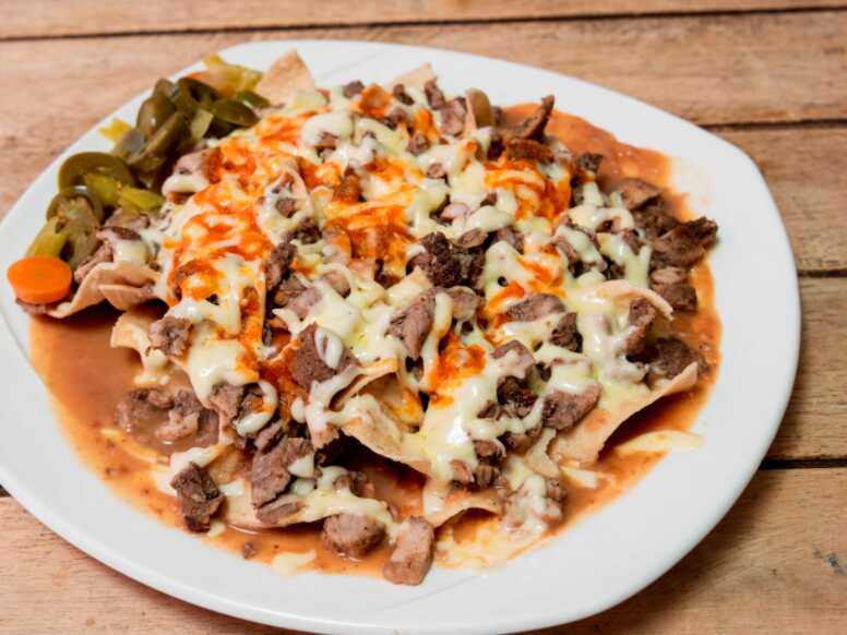 totopos, frijoles, carne asada o pastor, salsa roja y queso.