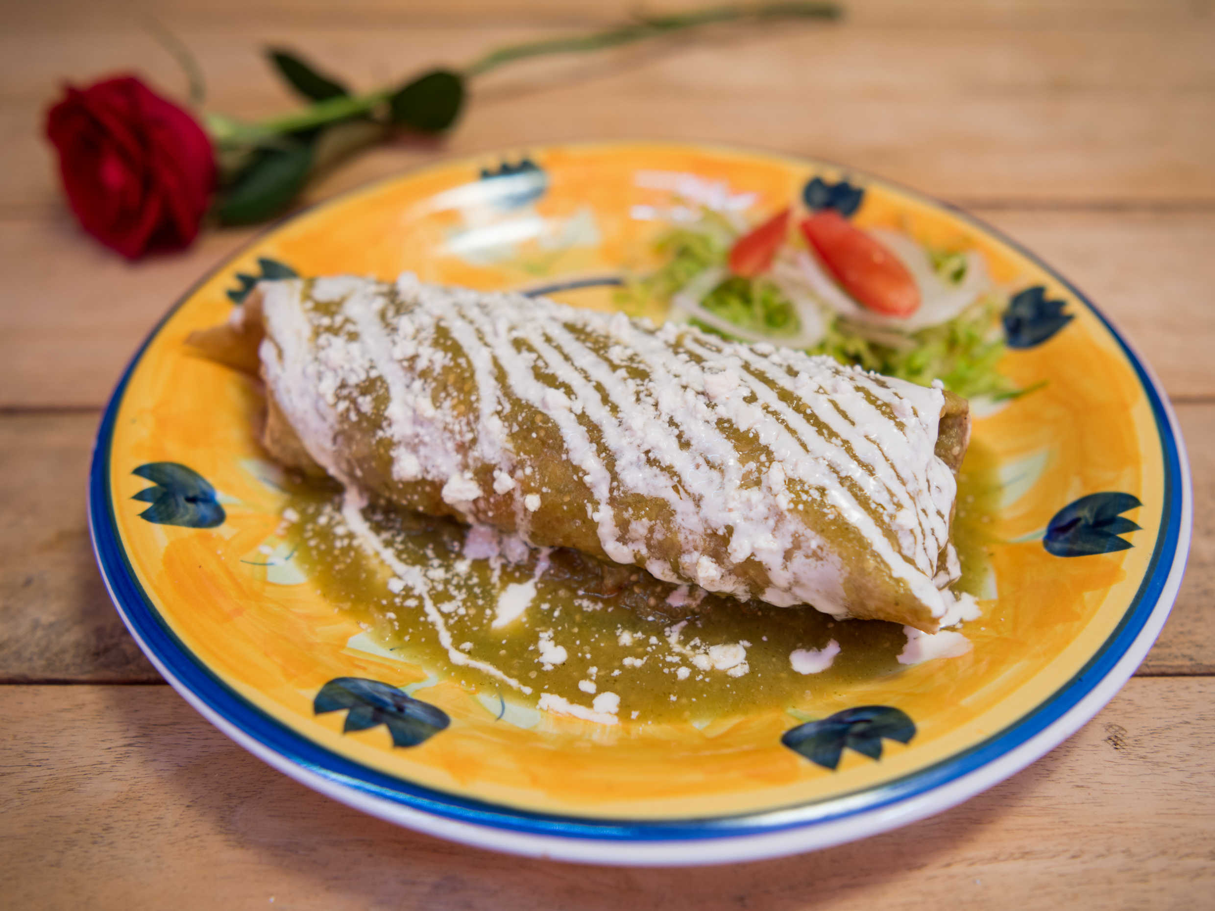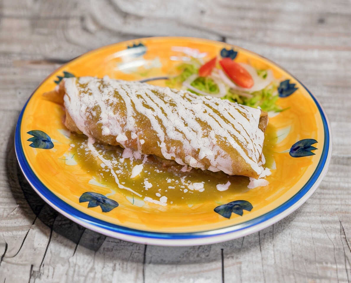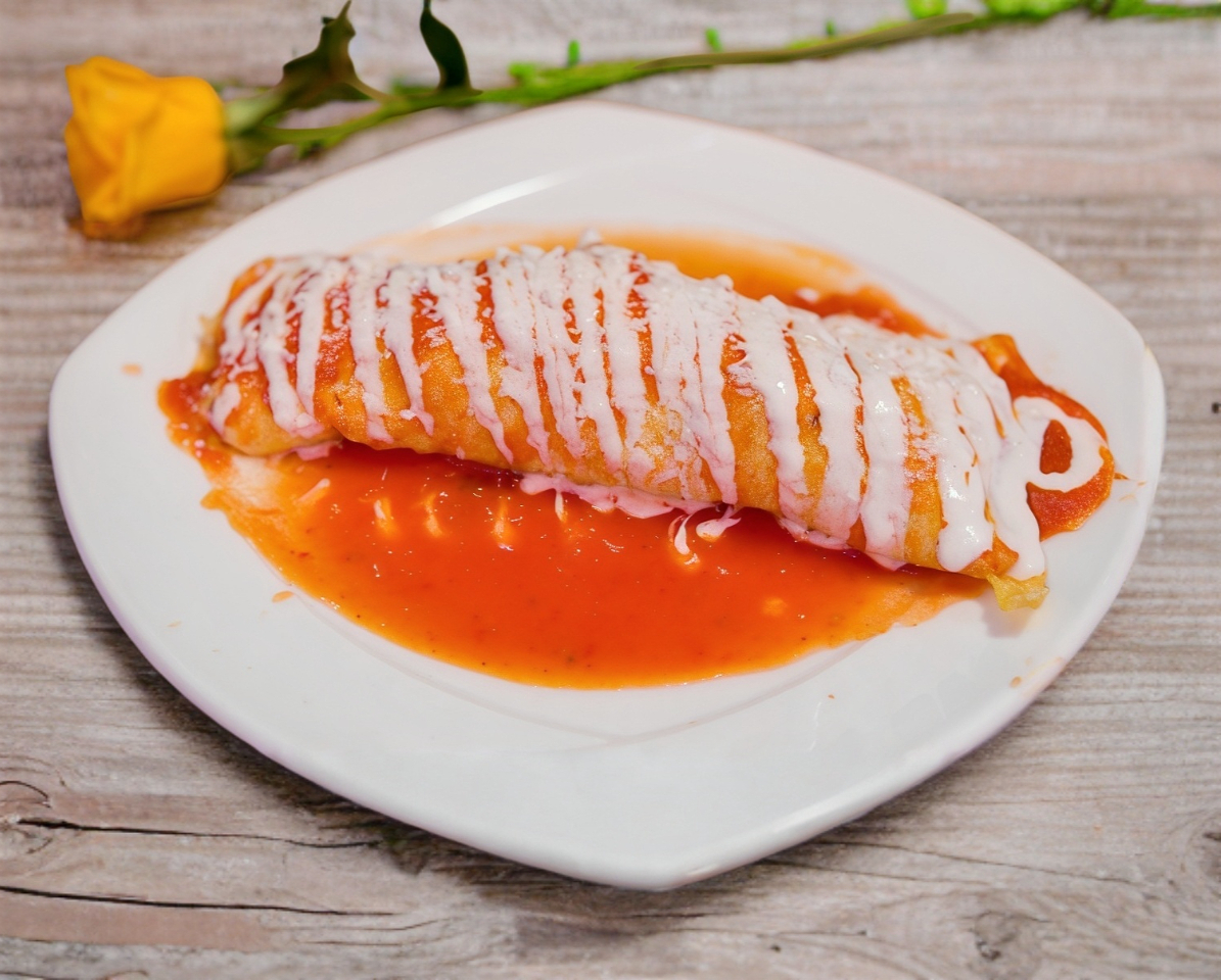 Tortilla de harina, frijol, arroz, queso y pollo desmenuzado, bañado en salsa de tu eleccion, con crema y queso sopero.