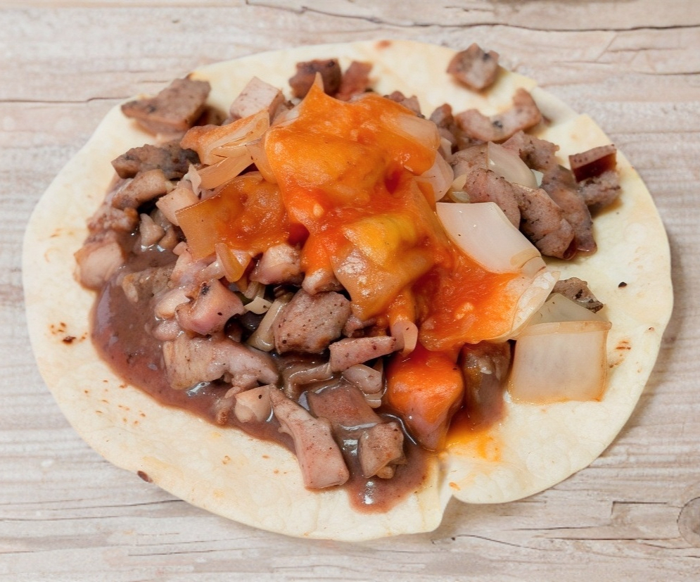 Tortilla de maiz con carne asada, frijol, queso manchego derretido, salsa roja y cebolla asada.