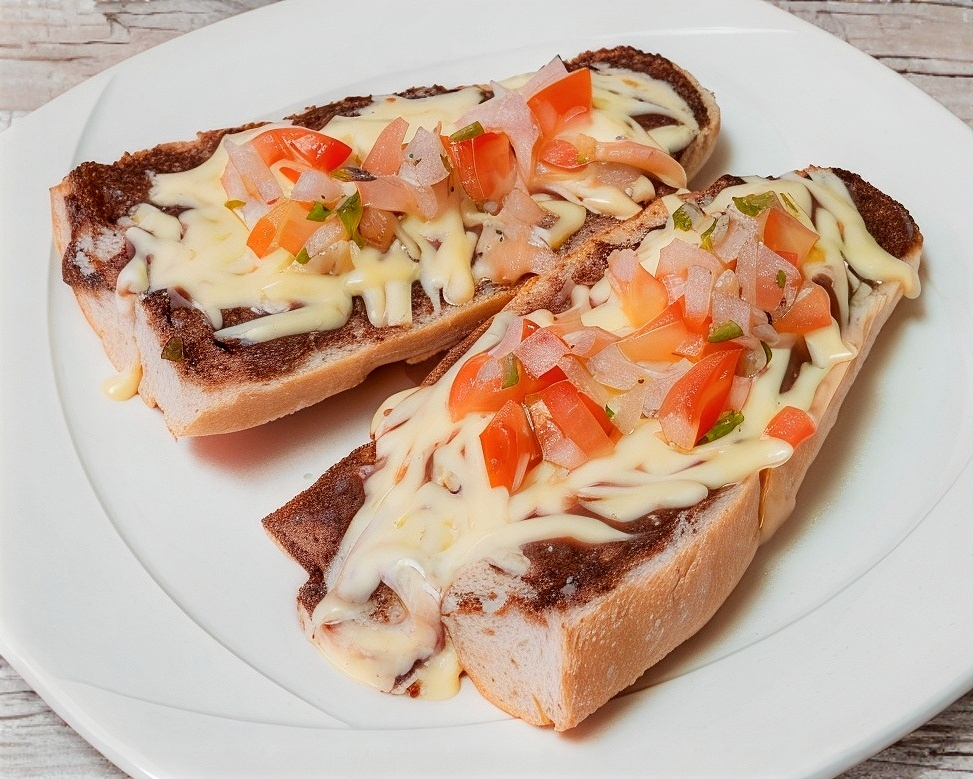(2 piezas de pan frances con frijol negro y queso manchego derretido, pico de gallo aparte).
