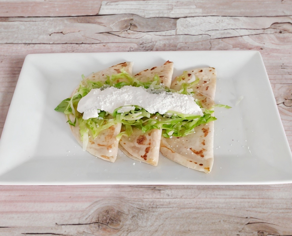 3 piezas de tortillas de harina rellenas de queso manchego derretido.