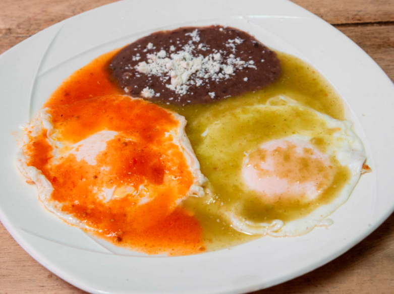Dos huevos estrellados, uno bañado con salsa roja y otro con salsa verde.