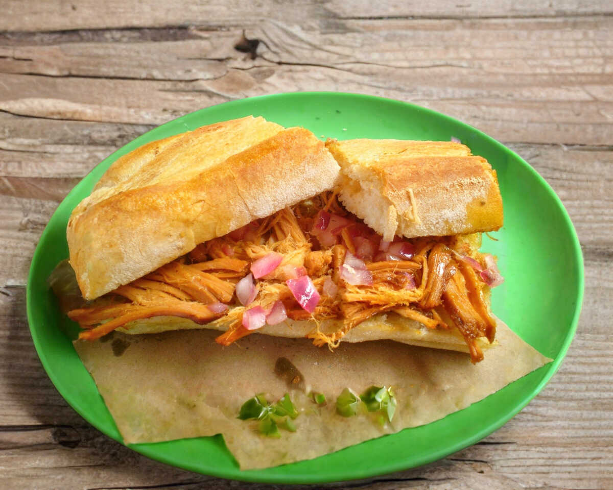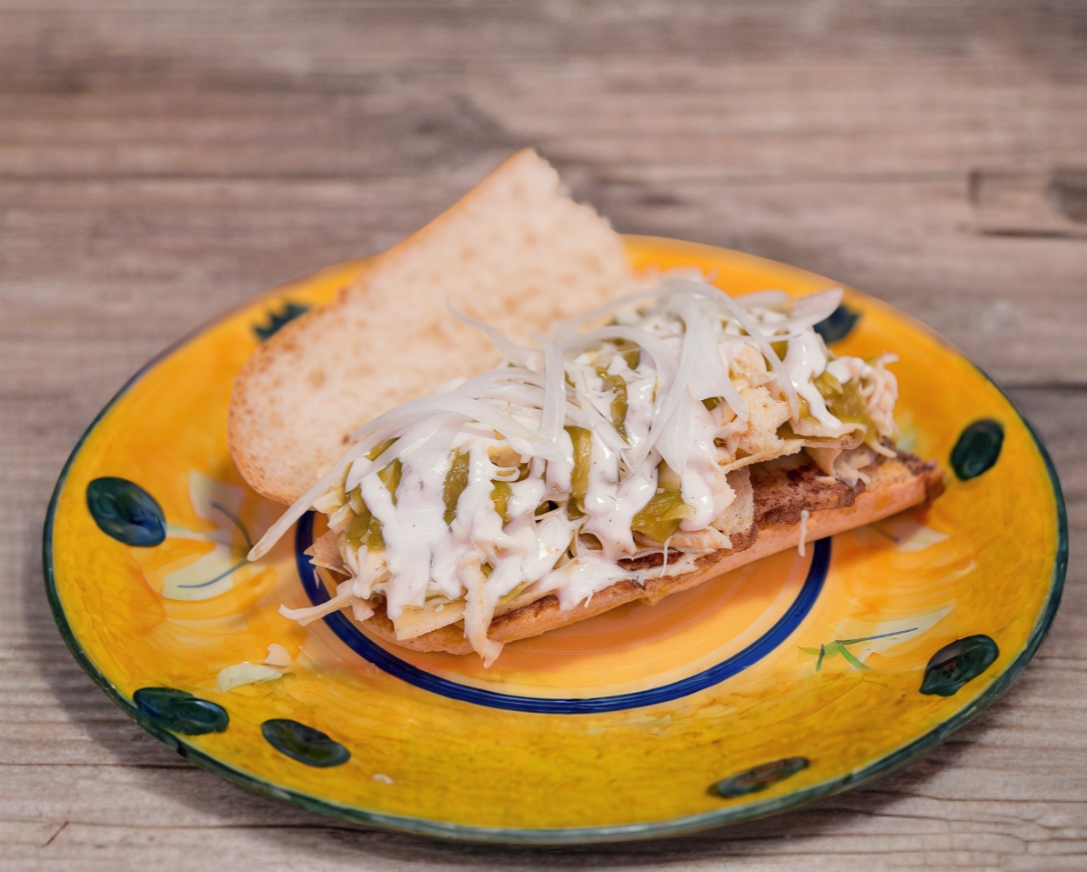 Pan francés relleno de pechuga de pollo desmenuzada con frijol, lechuga y jitomate.