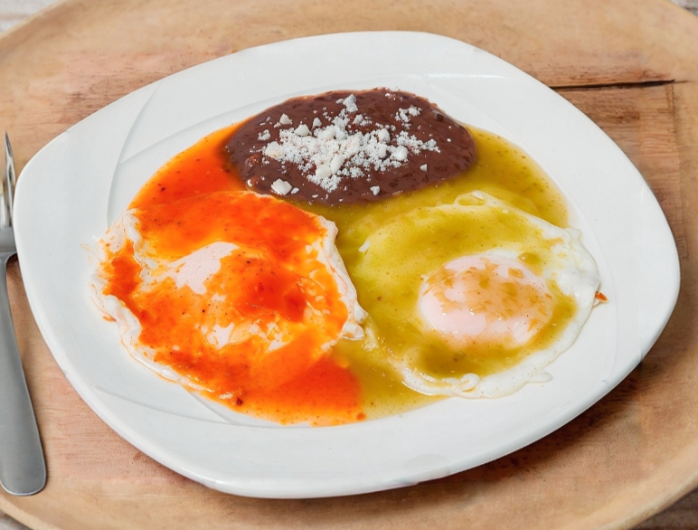 Los tradicionales huevos motuleños, acompañado con la salsa especial de la casa y platinos fritos.