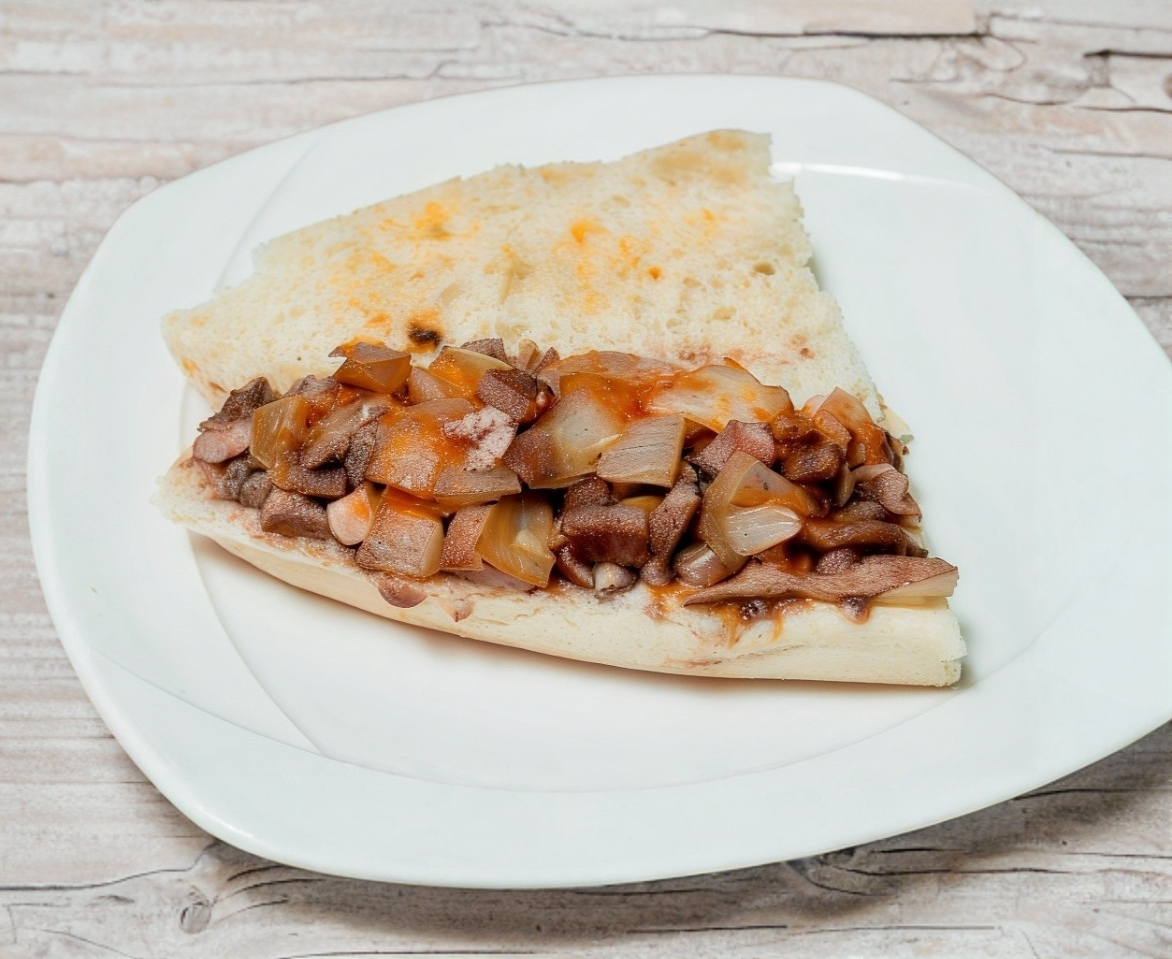 Pan frances relleno de carne asada con frijol, salsa roja y cebolla asada.