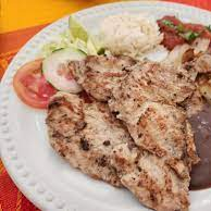 4 tortillas rellena de pollo desmenuzado, bañadas en salsa a suiza, con crema, queso derretido y cebolla blanca).