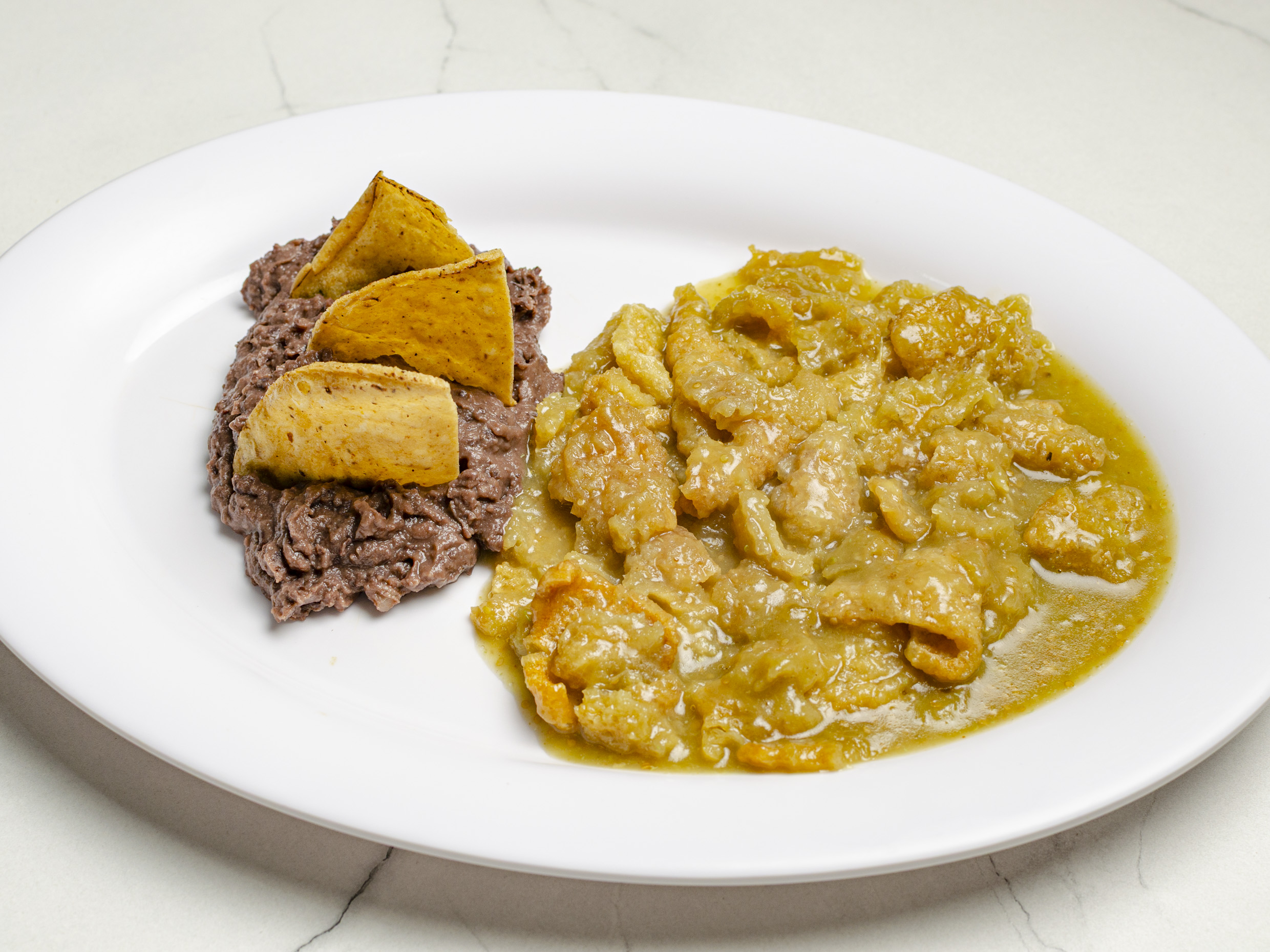 Chicharrón (70g), frijoles refritos (60g) Incluye tortillas (4 piezas).