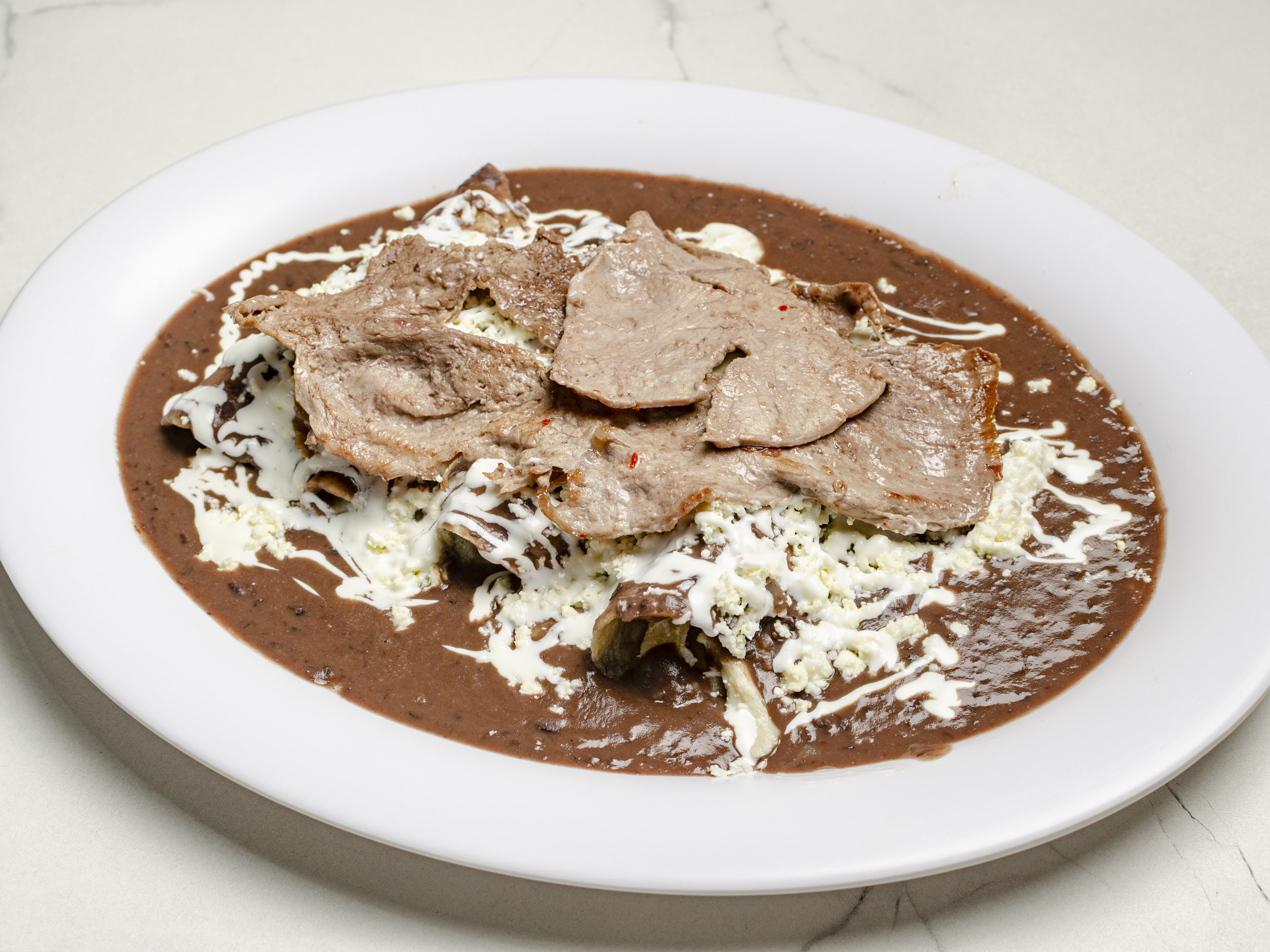 Nuestra máxima creación, chilaquiles con costilla de res ó poc chuc, pollo deshebrado, chorizo, huevo, aguacate, crema, queso de Chiapas y cebolla.