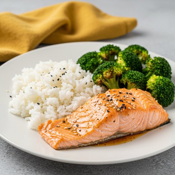 Salmón marinado en salsa mongolian acompañada de arroz y brócoli rostizado. Incluye limón, tortillas y salsa (aparte).
