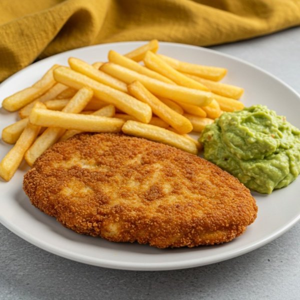 Milanesa de pollo empanizada (100 g) acompañada con guacamole y papas fritas (180 g).Incluye limón, tortillas y salsa (aparte).