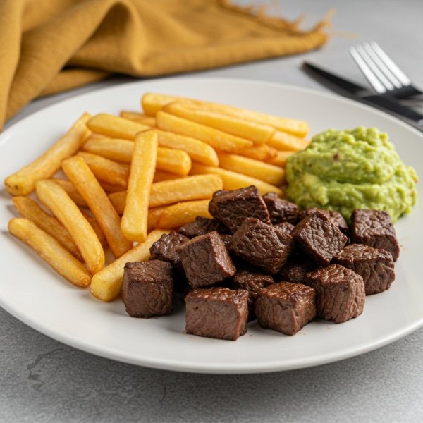 Arrachera (220 g) acompañada con guacamole y papas fritas (180 g). Incluye limón, tortillas y salsa (aparte).