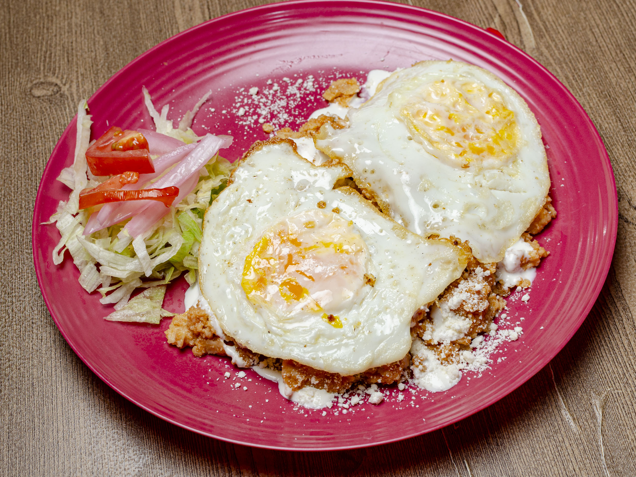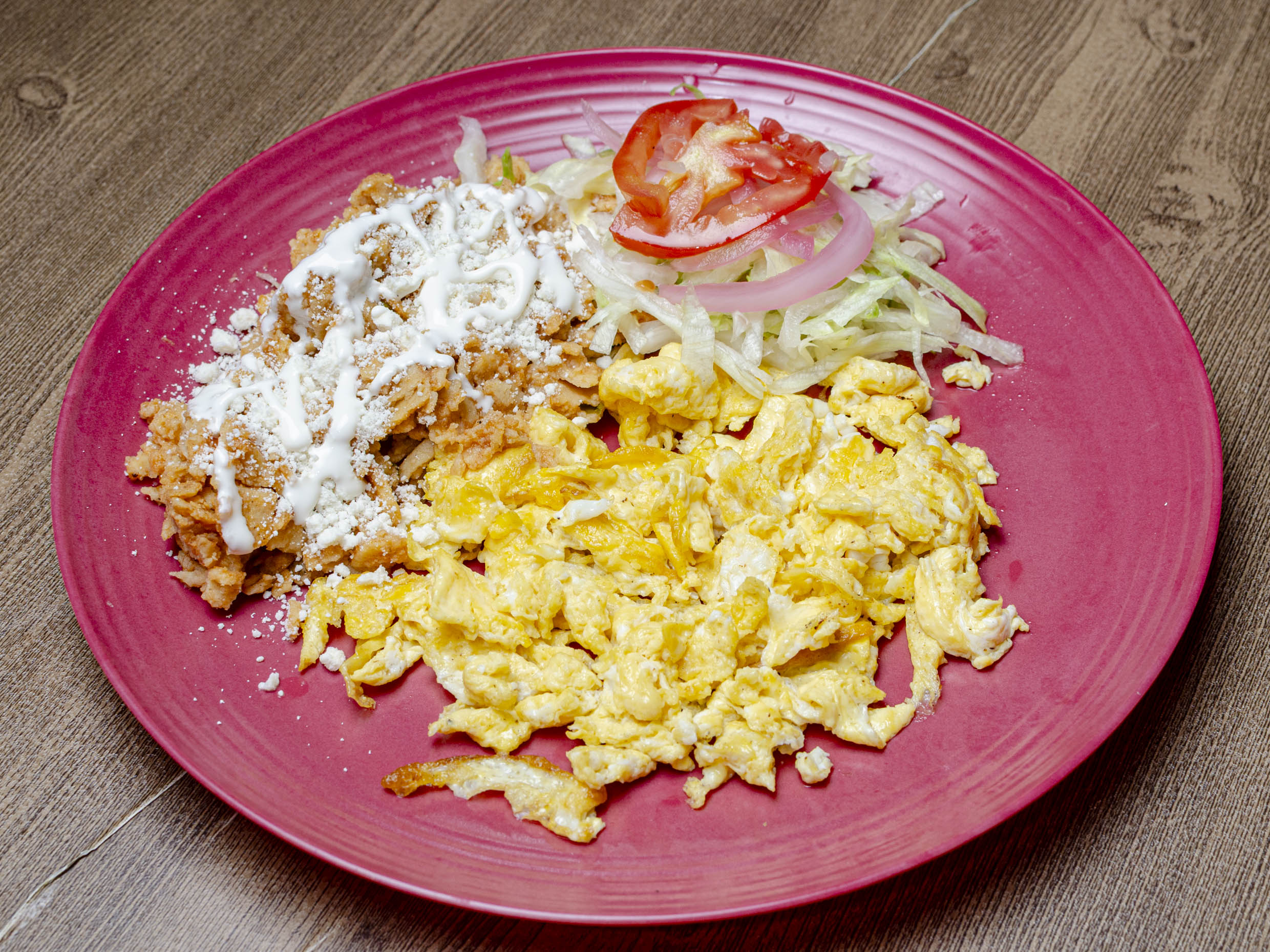 2 Huevos acompañados de chilaquiles o arroz, ensalada y pan.