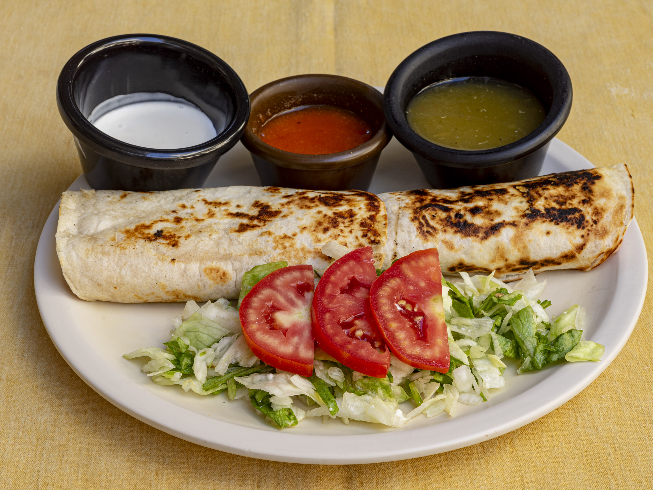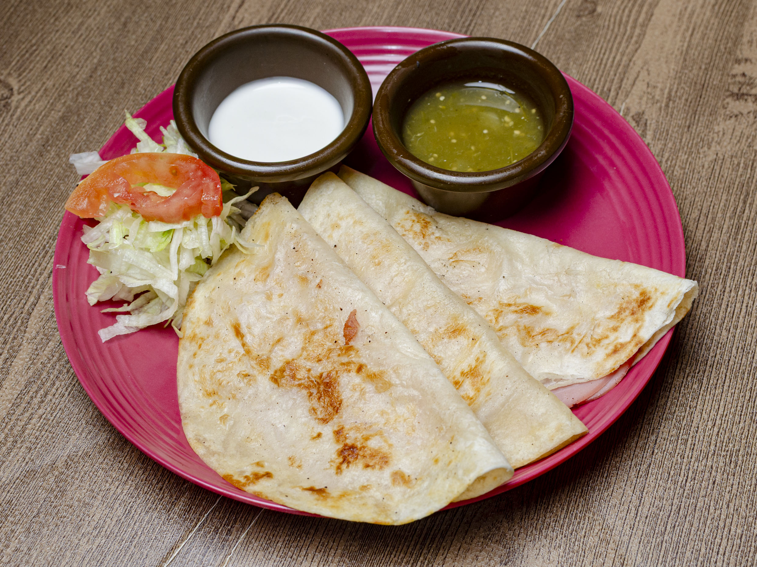 Tres tortillas de harina rellenas de jamón de pavo y queso manchego. Acompañadas de lechuga, crema, salsa verde y limón aparte.