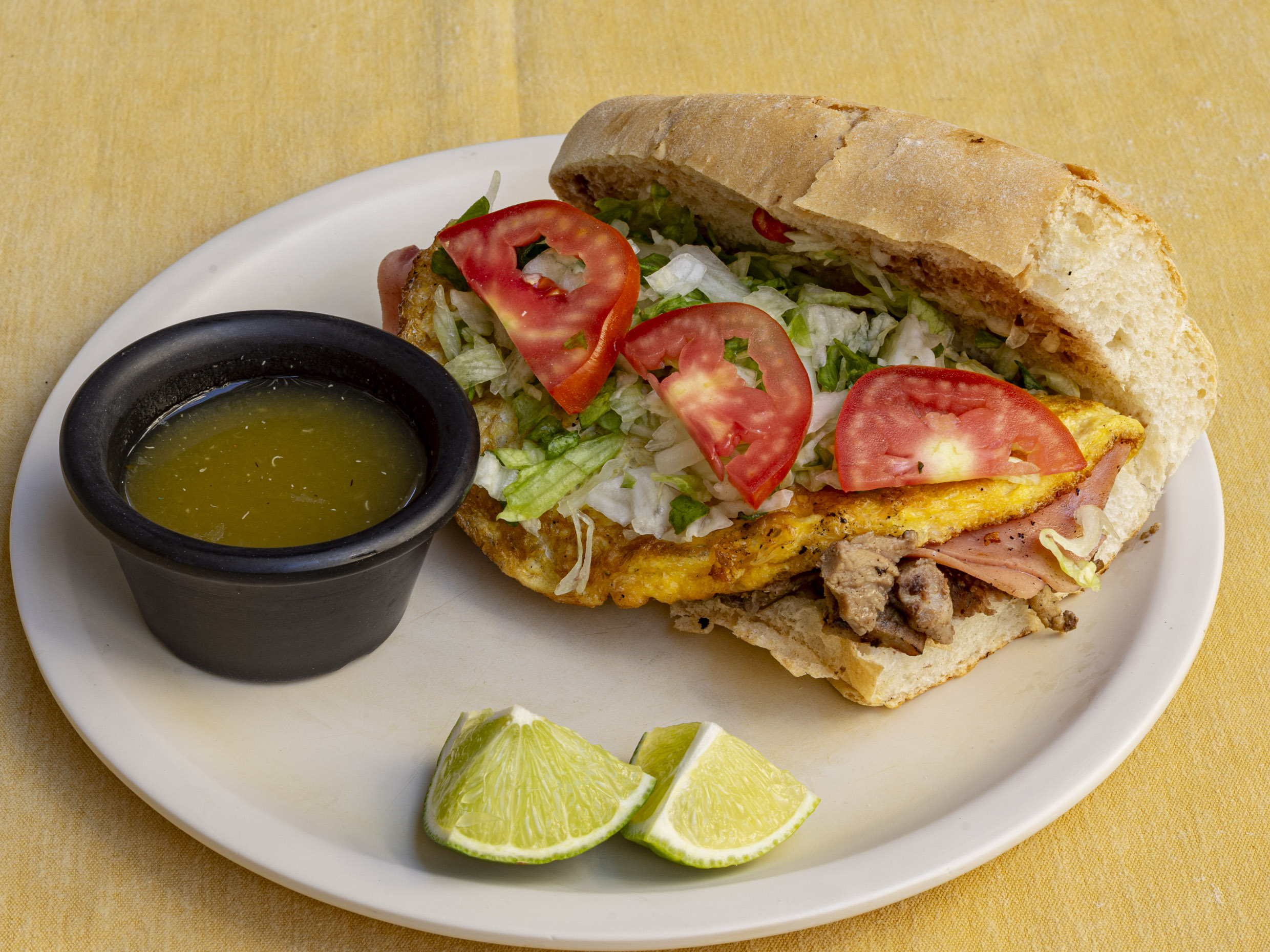 Media barra de pan francés con frijol colado, 50 g de carne de cerdo asada con cebolla, un esponjoso omelette de jamón de pavo, queso manchego derretido, lechuga fresca y jitomate jugoso. Todo acompañado de salsa picante y limón para el remate perfecto. ¡Una torta tan poderosa que merece respeto!