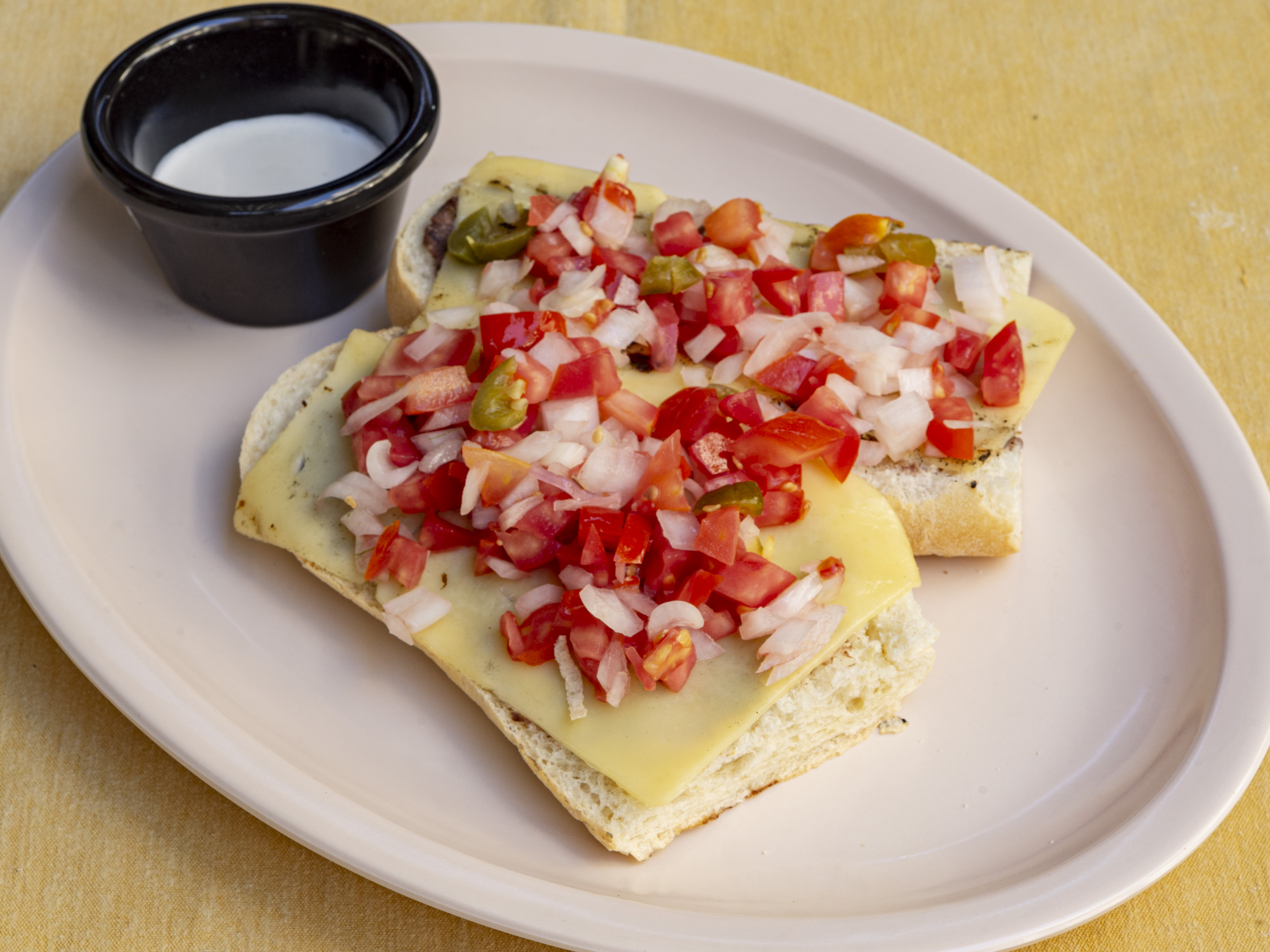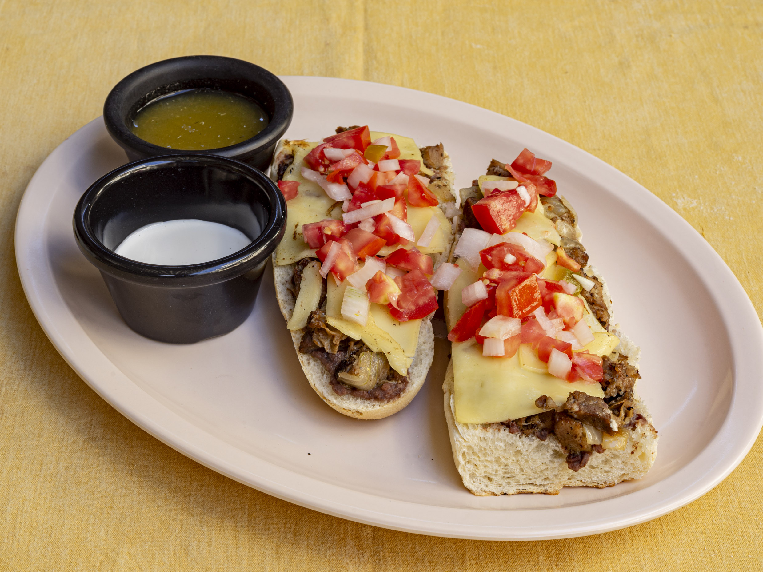 Telera partida a la mitad con una base de frijoles, queso manchego gratinado, carne asada picada con cebolla y un pico de gallo. Acompañado de crema.