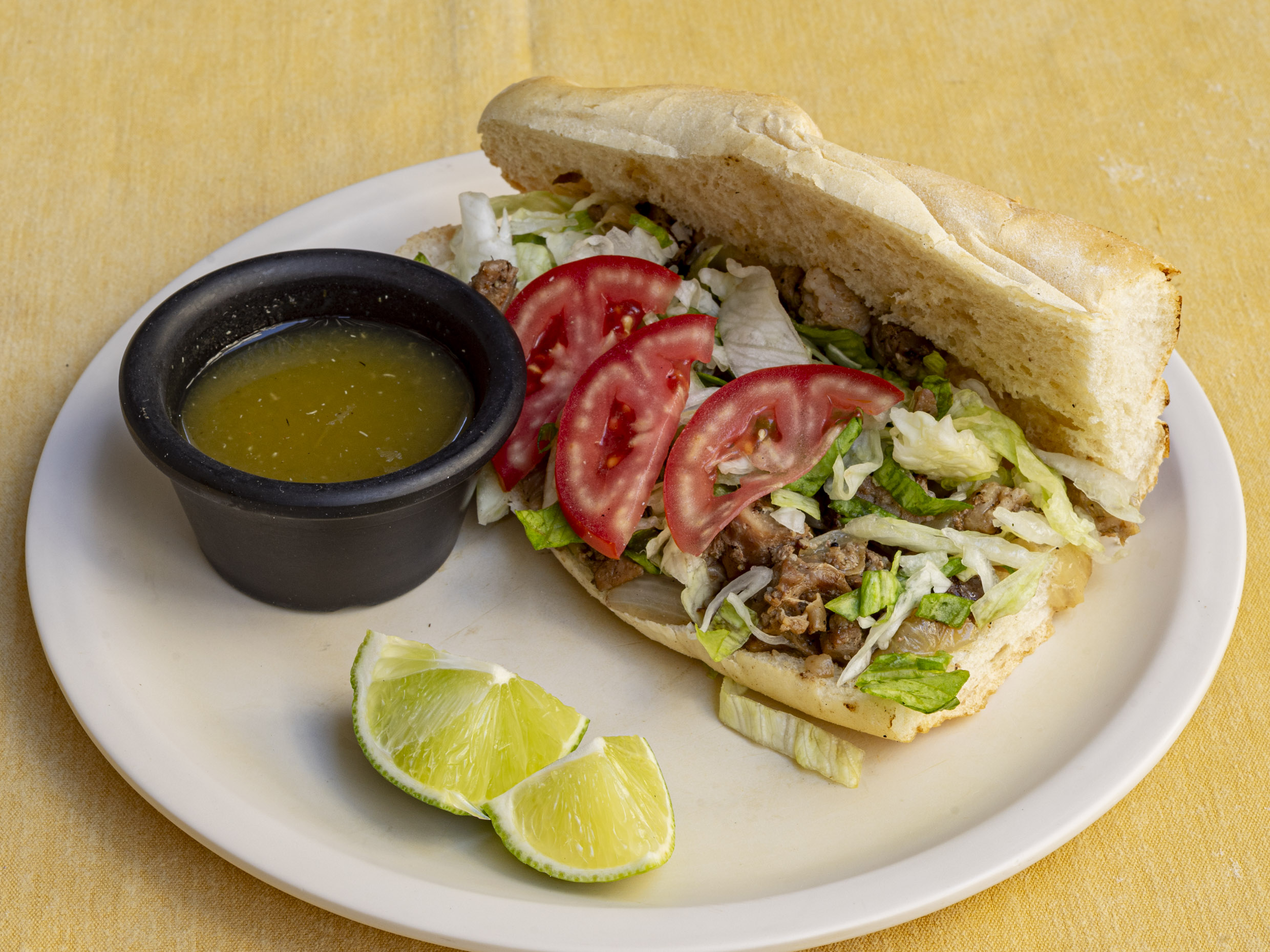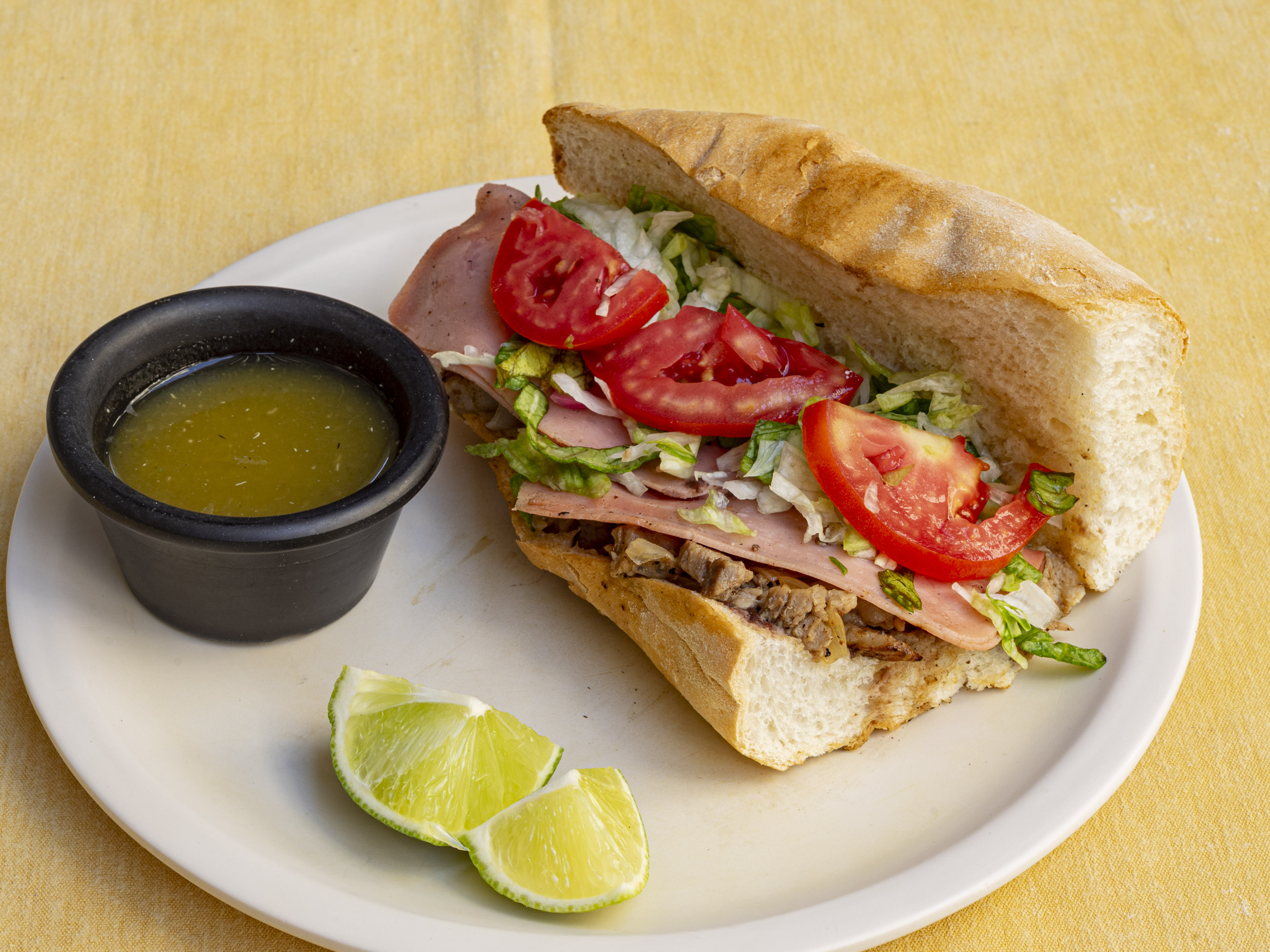Media barra de pan artesanal con una base de frijoles colados, coronada con 50 g de carne asada de cerdo con cebolla (¡sin opción a quitarla porque es la clave del sabor!), dos rebanadas de jamón de pavo, queso manchego derretido, lechuga fresca y jitomate en rodajas. Acompañada con salsa brava y limón al gusto.
