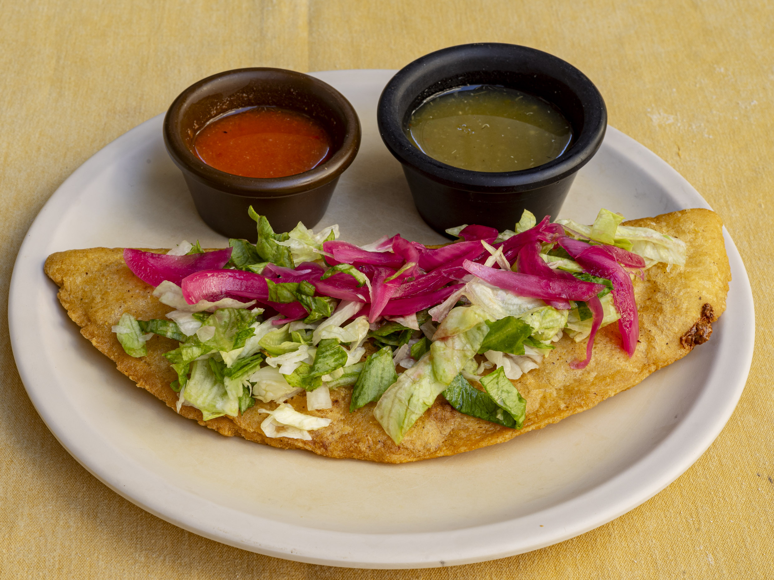 Empanada de carne molida de cerdo, acomañada de lechuga, cebolla, picante y tomate