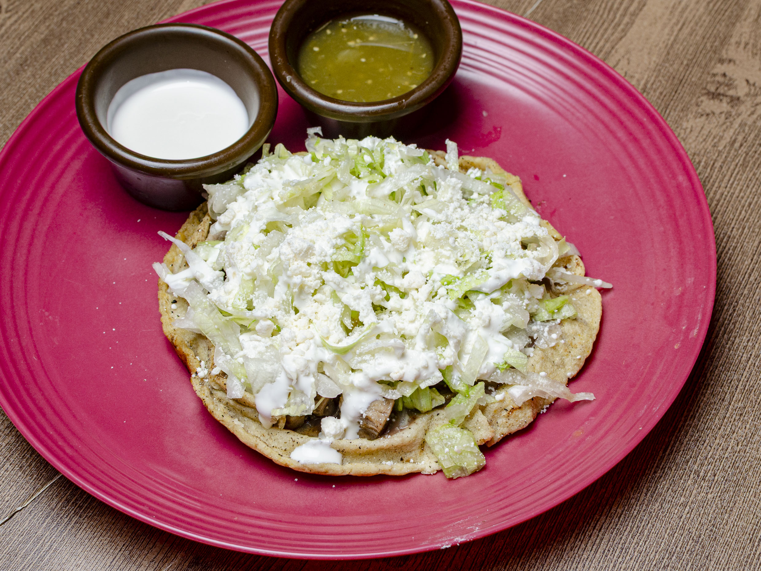Base de masa con frijol, carne asada con cebolla, lechuga, crema y queso. mide aprox. 15 cm.