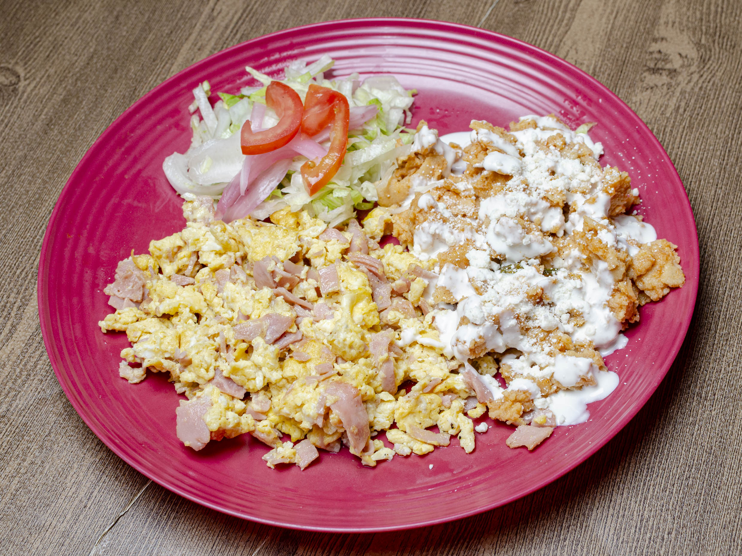 2 Huevos con jamón de pavo acompañados dechilaquiles o arroz, ensalada y pan.