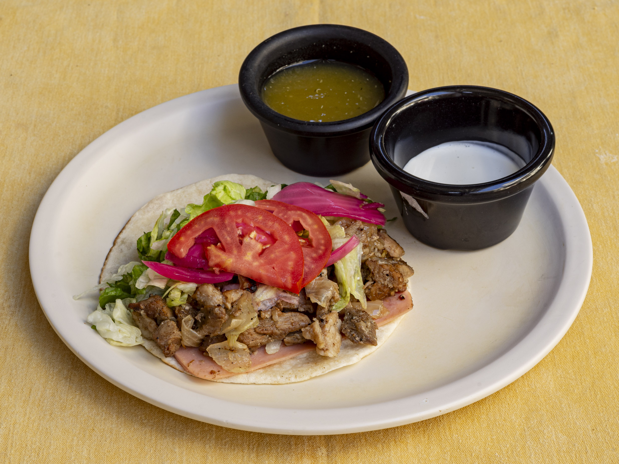 Tortilla de harina rellena de una base de frijol, carne asada picada con cebolla, jamón de pavo, queso manchego y lechuga. Acompañada de crema, salsa verde y limón aparte.