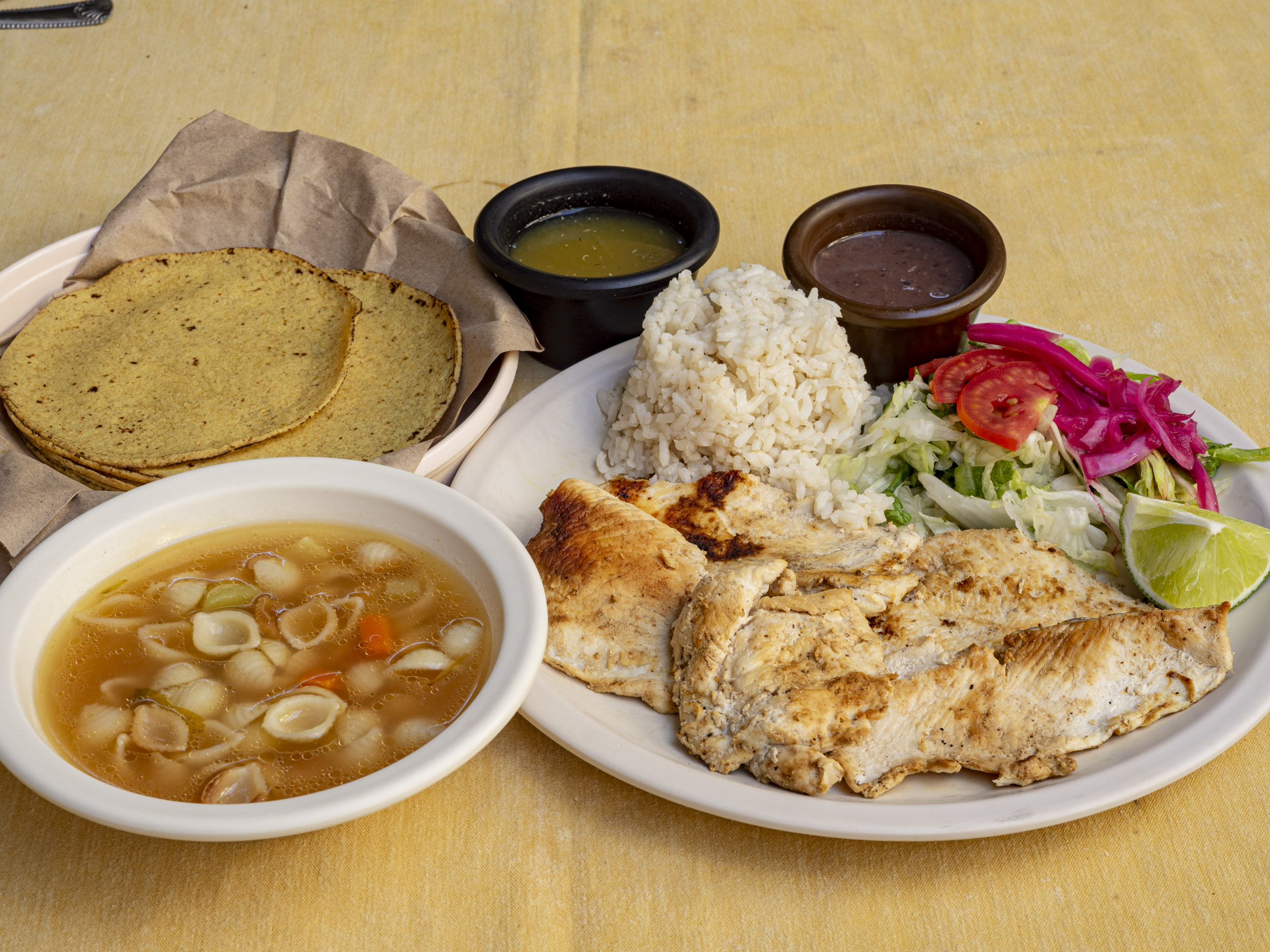 El sabor de la cocina de casa: pechuga a la plancha, con frijol suave, arroz calientito, ensalada que refresca y sopa que abraza. Tortillas para acompañar el recuerdo.. Tratamos de reducir el uso de plásticos, si no necesitas los cubiertos por favor índicalo. Gracias.