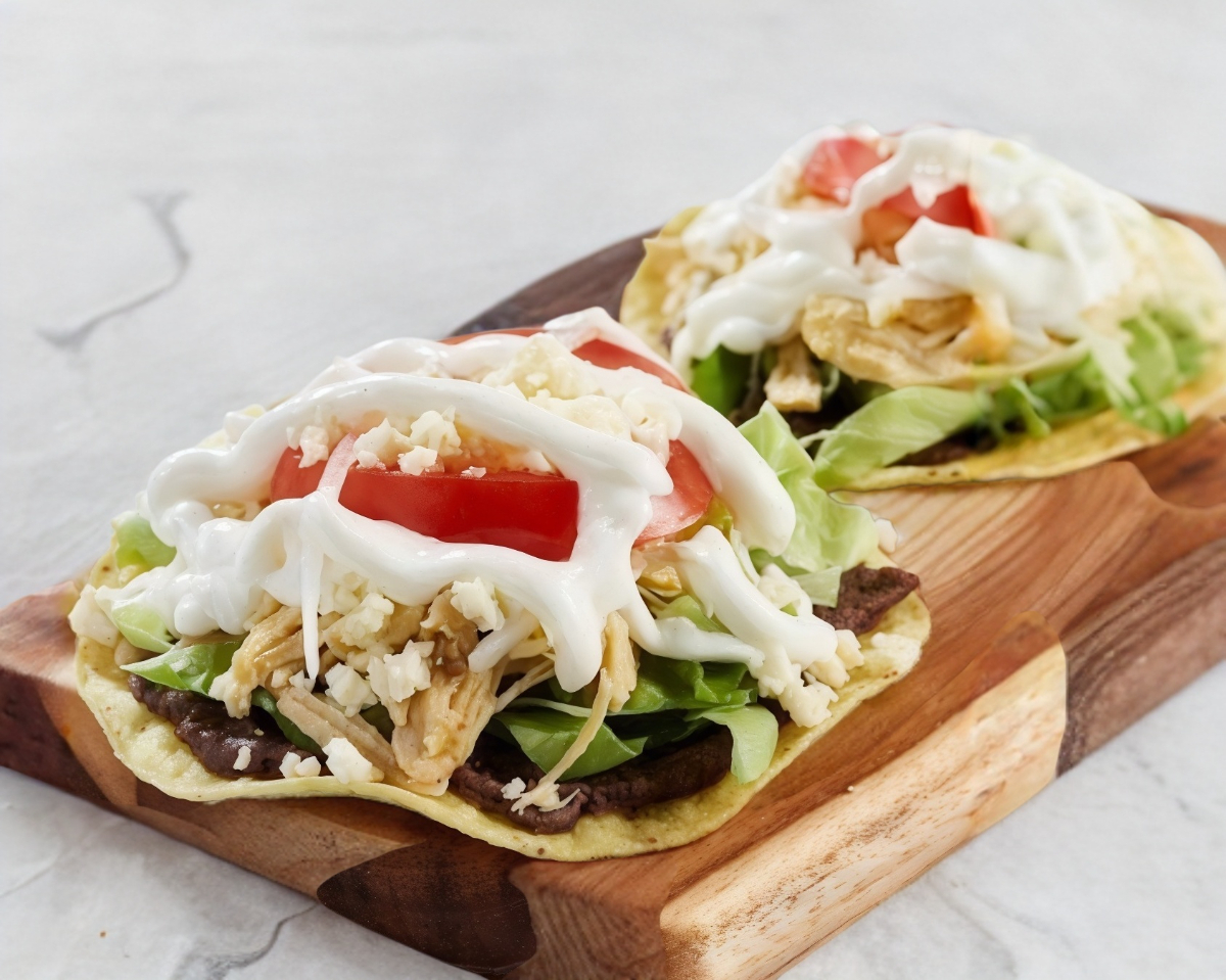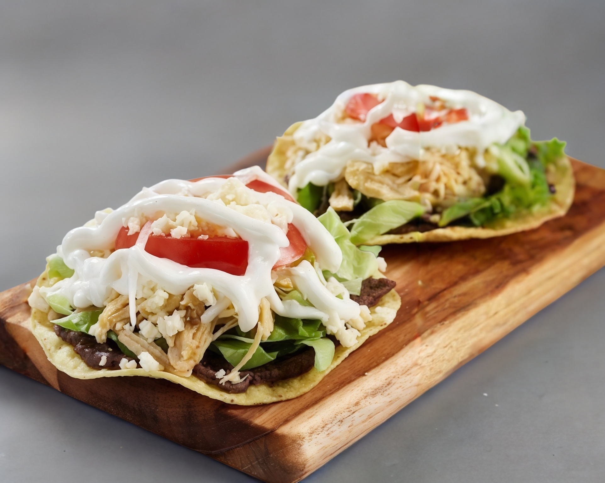 Tostada Con Frijol, Lechuga, pollo, Queso, Crema y Tomate.