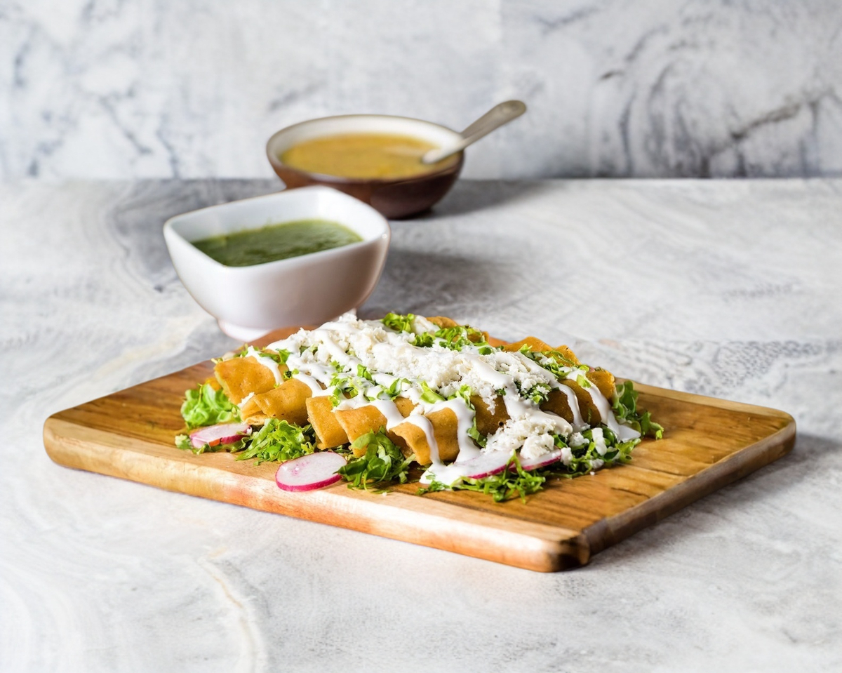 Taquitos de pollo acompañado con Romanita, Salsa verde, Queso y Crema
