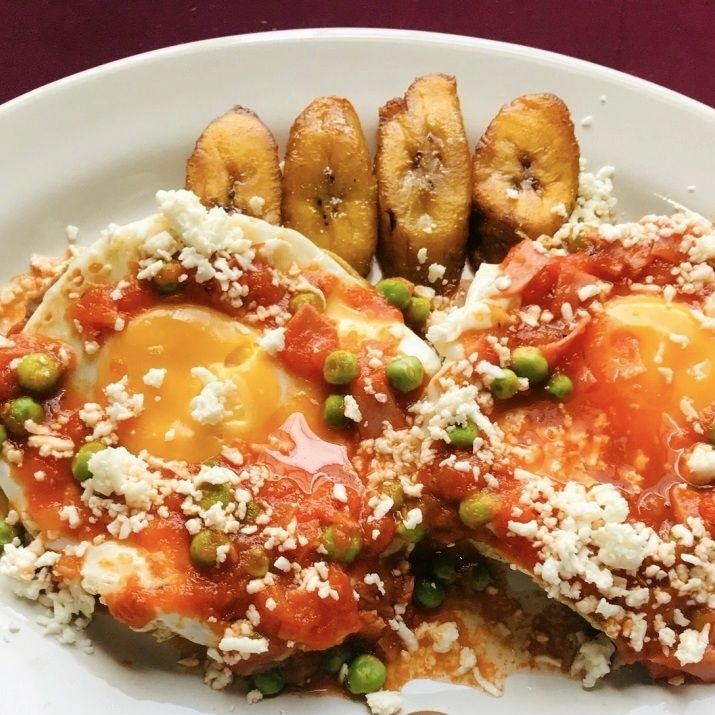 Tostadas Con Frijol, huevito frito, platanos, salsa de tomate con chicharos, queso, jamon,