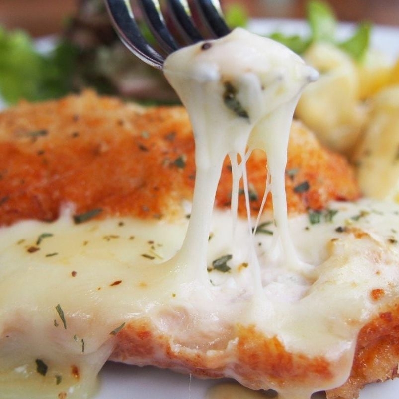 Pechuga de pollo parmesana con Arroz, Frijol, ensalada y tortillas