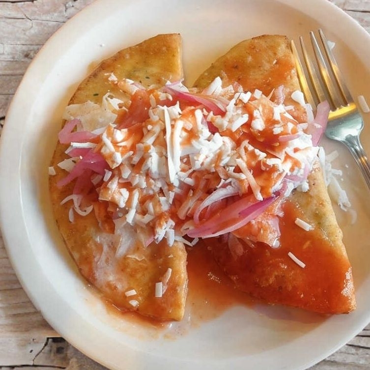 Tostadas con salsa roja, pollo desebrado, queso, crema, cebolla y cilantro,