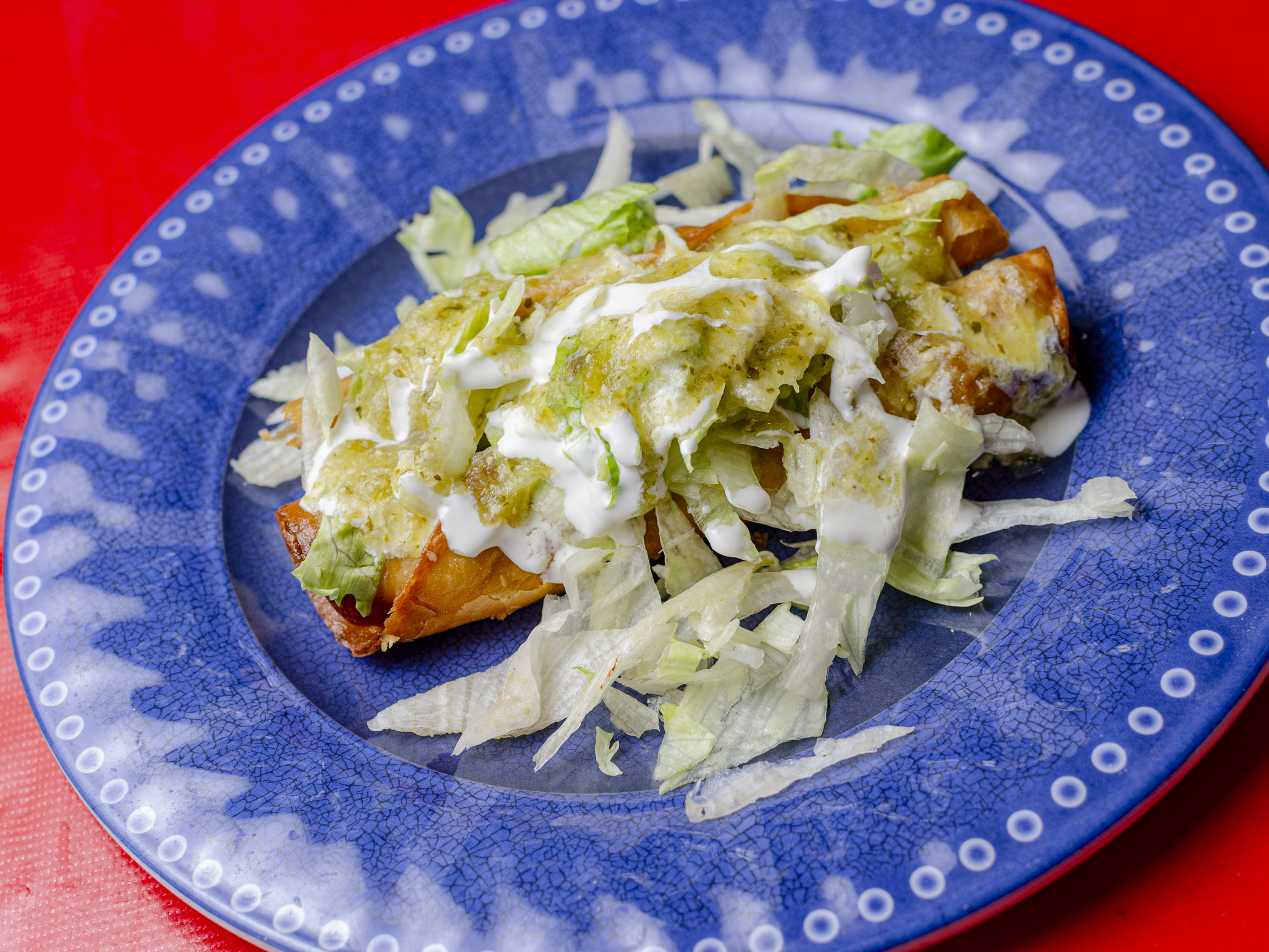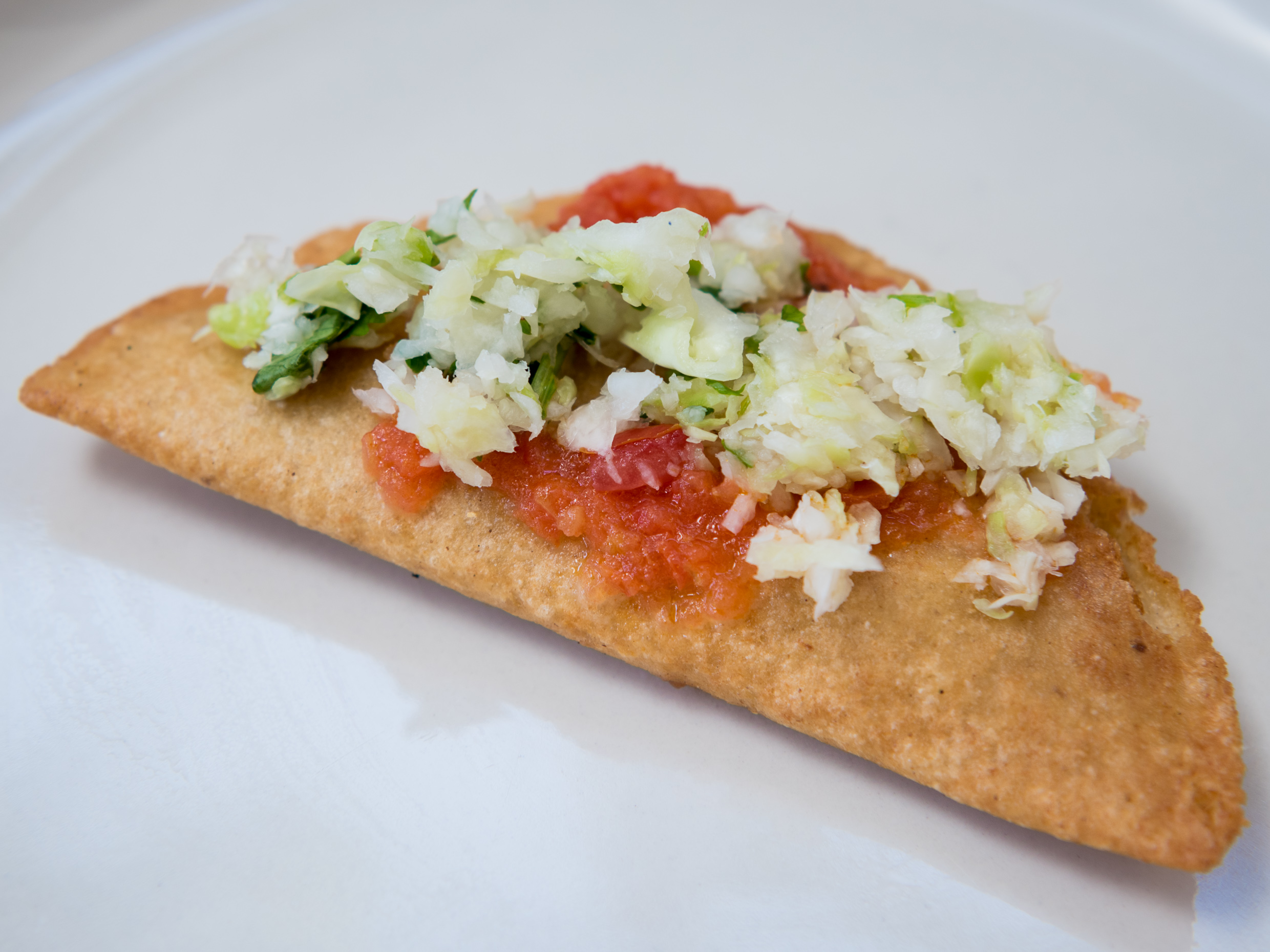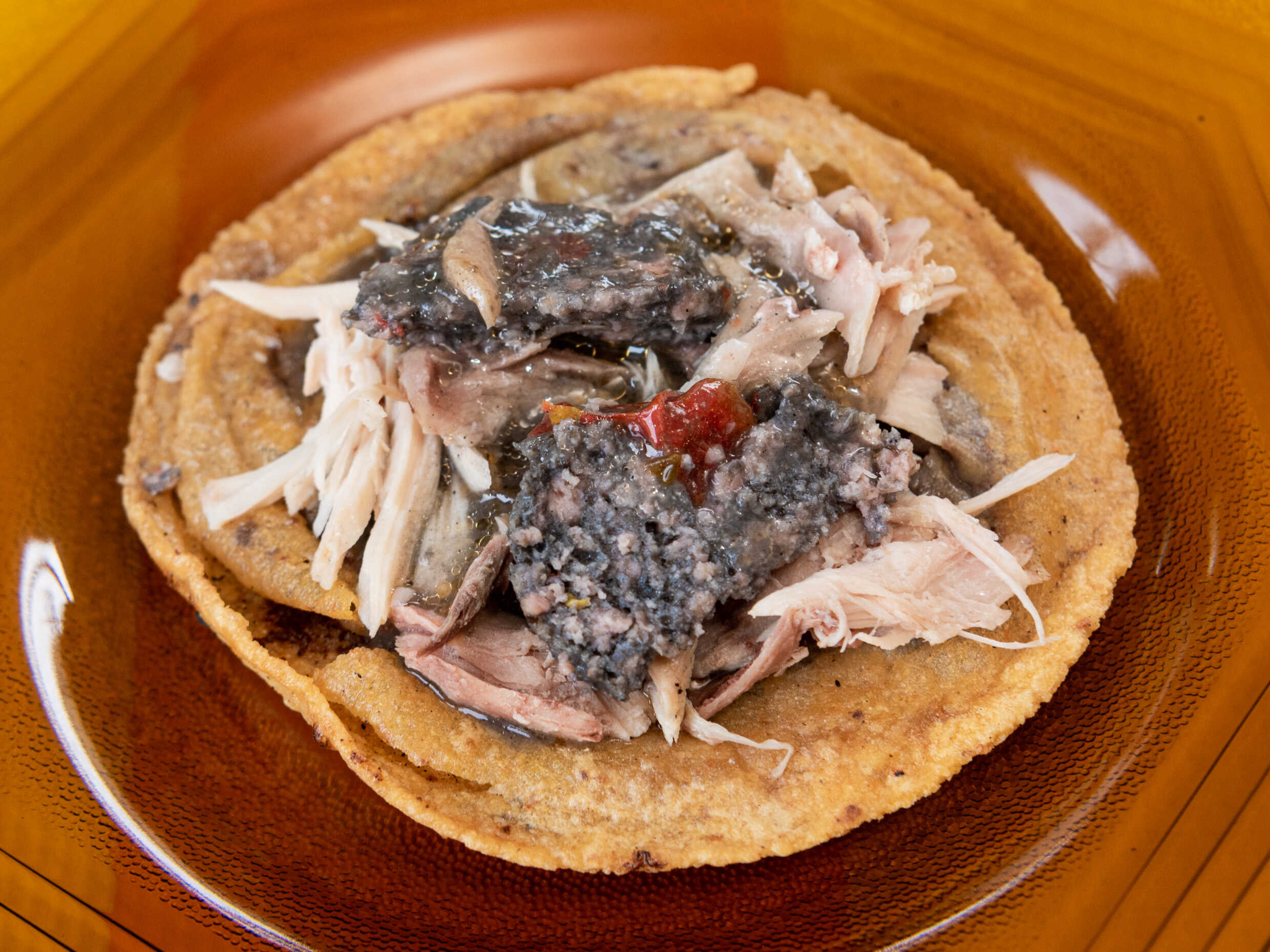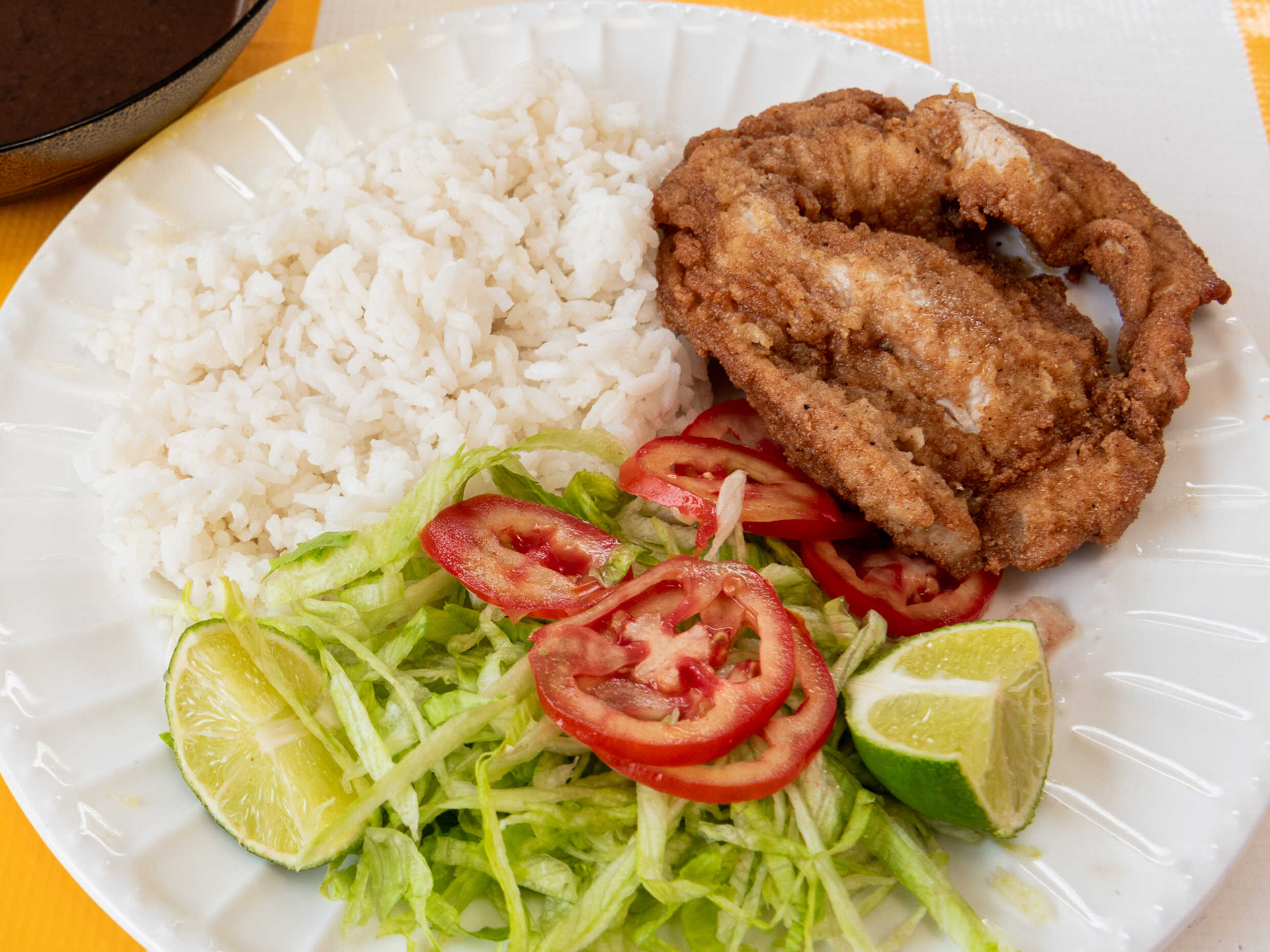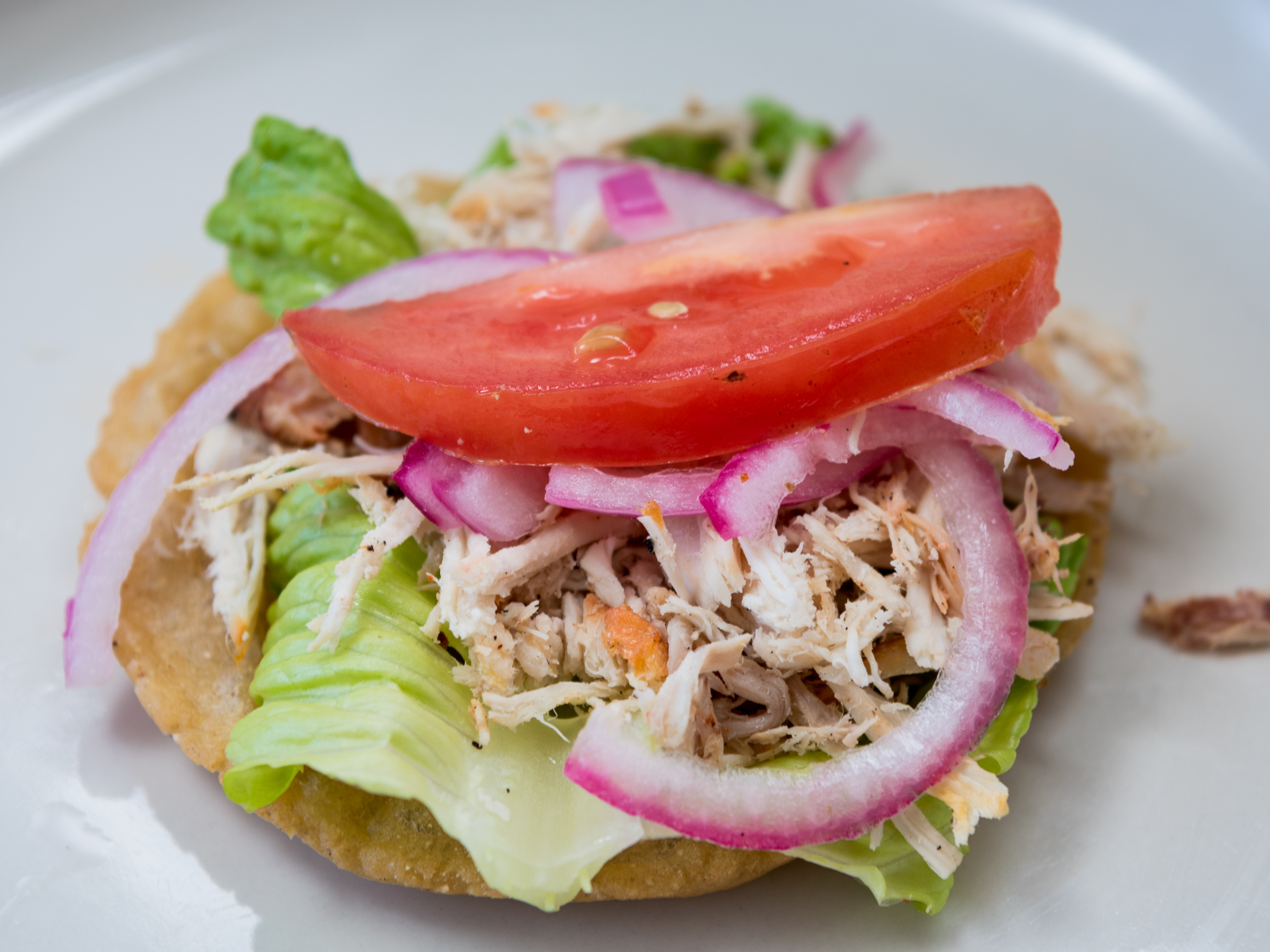 Frijol, pollo asado, lechuga, tomate, cebolla roja.